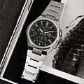 Кварцевый японский механизм Miyota. Точность хода не хуже -10 +15 сек./в месяц. Часы оснащены функцией хронографа. Циферблат серебристого цвета с контрастными индексами. Стрелки и индексы с светонакопительным нанесением. Корпус и браслет выполнены из нержавеющей стали. Сапфировое стекло устойчиво к появлению царапин. Водонепроницаемость 100М. В часах можно плавать. Степень водонепроницаемости не является величиной, эквивалентной функциональной рабочей глубине.