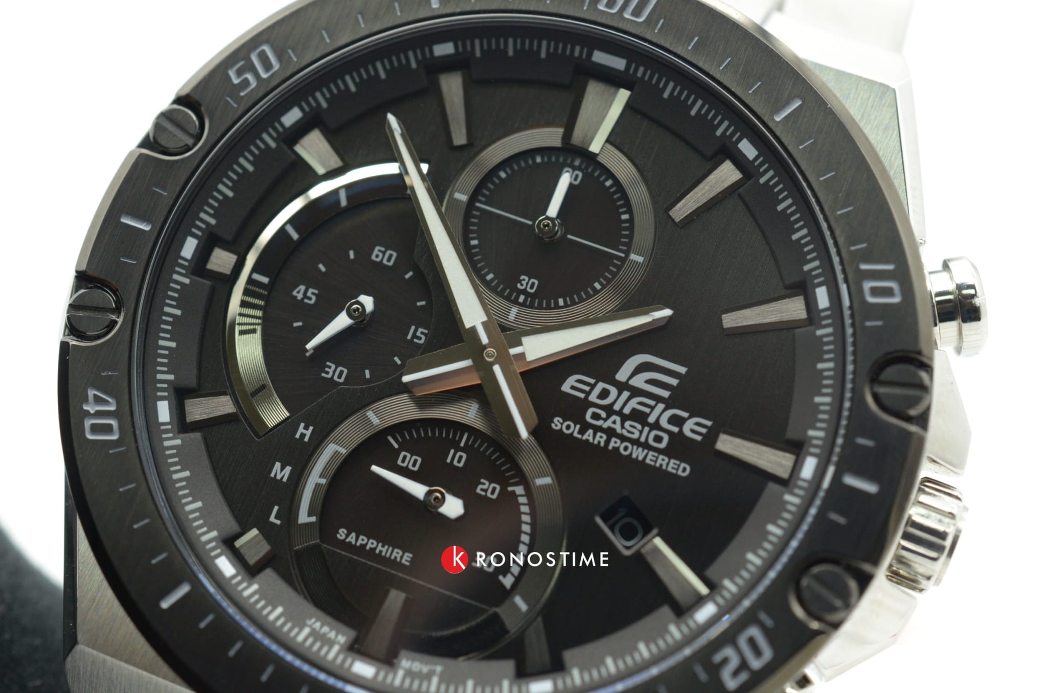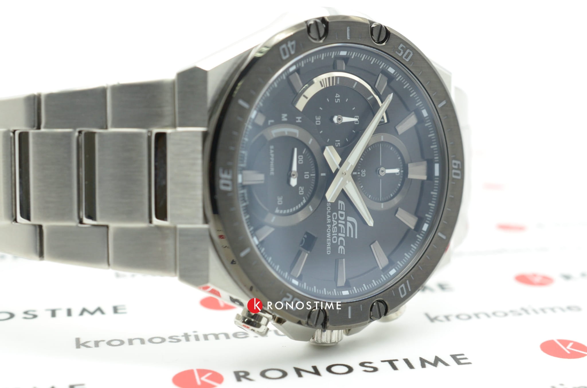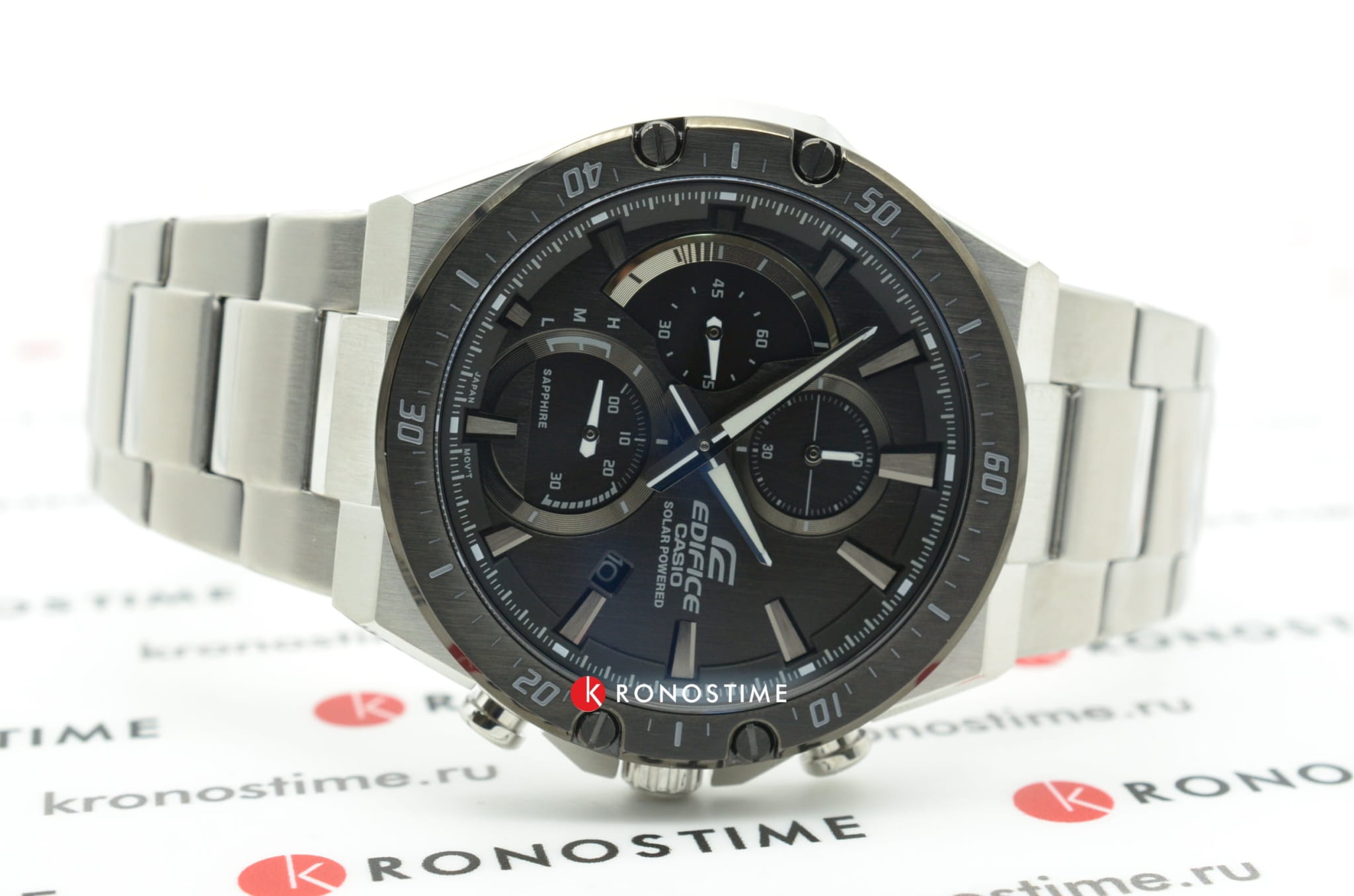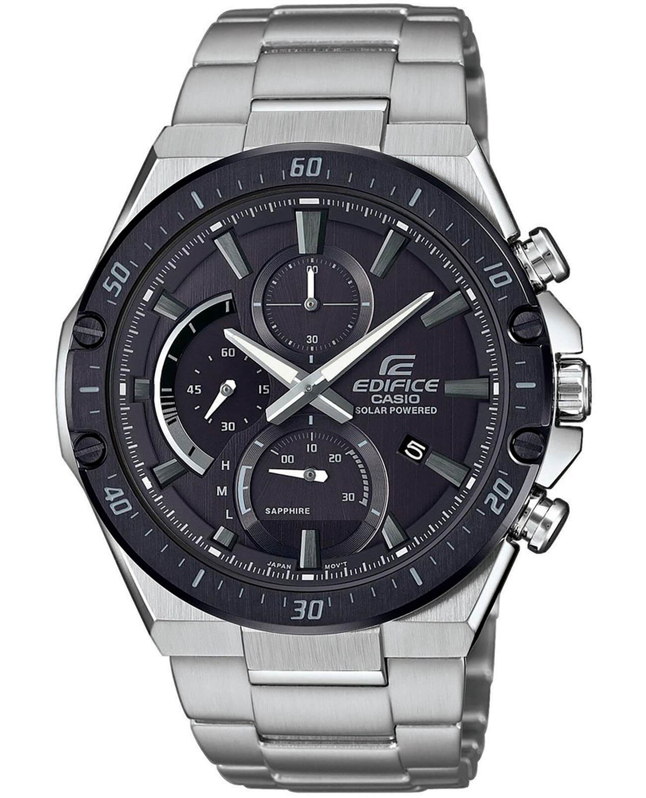 Наручные часы в чёрно-серебристом исполнении привлекают контрастными деталями и лаконичным оформлением. Помогут идеально дополнить образ на каждый день. Аксессуар стал обладателем ультратонкого корпуса, по сравнению с большинством представителей Edifice – 9,9 мм. Модель изготовлена из стали 316L, материал устойчив к коррозии и механическим воздействиям. Чёрный безельБезельВнешний ободок, закрепляющий стекло. В спортивных часах так называется поворотное кольцо с делениями на циферблате, выполняет роль таймера – замеряет отрезки времени на шкале. Неподвижный безель – элемент декора. Однонаправленно вращающийся безель на дайверских часах позволяет фиксировать моменты погружения и выныривания на поверхность. имеет ионное IP-покрытиеIP-покрытиеМетод ионного напыления. Демонстрирует повышенную устойчивость к истиранию, окислению и химическим веществам. Под воздействием высокого давления и температуры около 1500°C молекулы металла надёжно соединяются с частицами корпуса часов.. Японский кварцевый механизм обеспечивает питанием солнечная батарейка . Указатель минутной стрелки хронографаХронографФункция позволяет измерять отрезки времени с особой точностью: часы, минуты, секунды. Верным признаком хронографа является наличие на циферблате 3 дополнительных окошек-счётчиков. на секторной части циферблата. Сапфировое стекло с антибликовым покрытием. Водостойкость 100 метров. Люминесцентная подсветкаЛюминесцентное покрытиеПозволяет считывать показания времени в темноте. Производители наносят на стрелки, часовые индексы, безель или поверхность циферблата светонакопительный состав, дающий холодное свечение.. Застёжка с системой блокировки. Секундомер, отображение числа. Габариты: 50,2 x 45,4 x 9,9 мм.