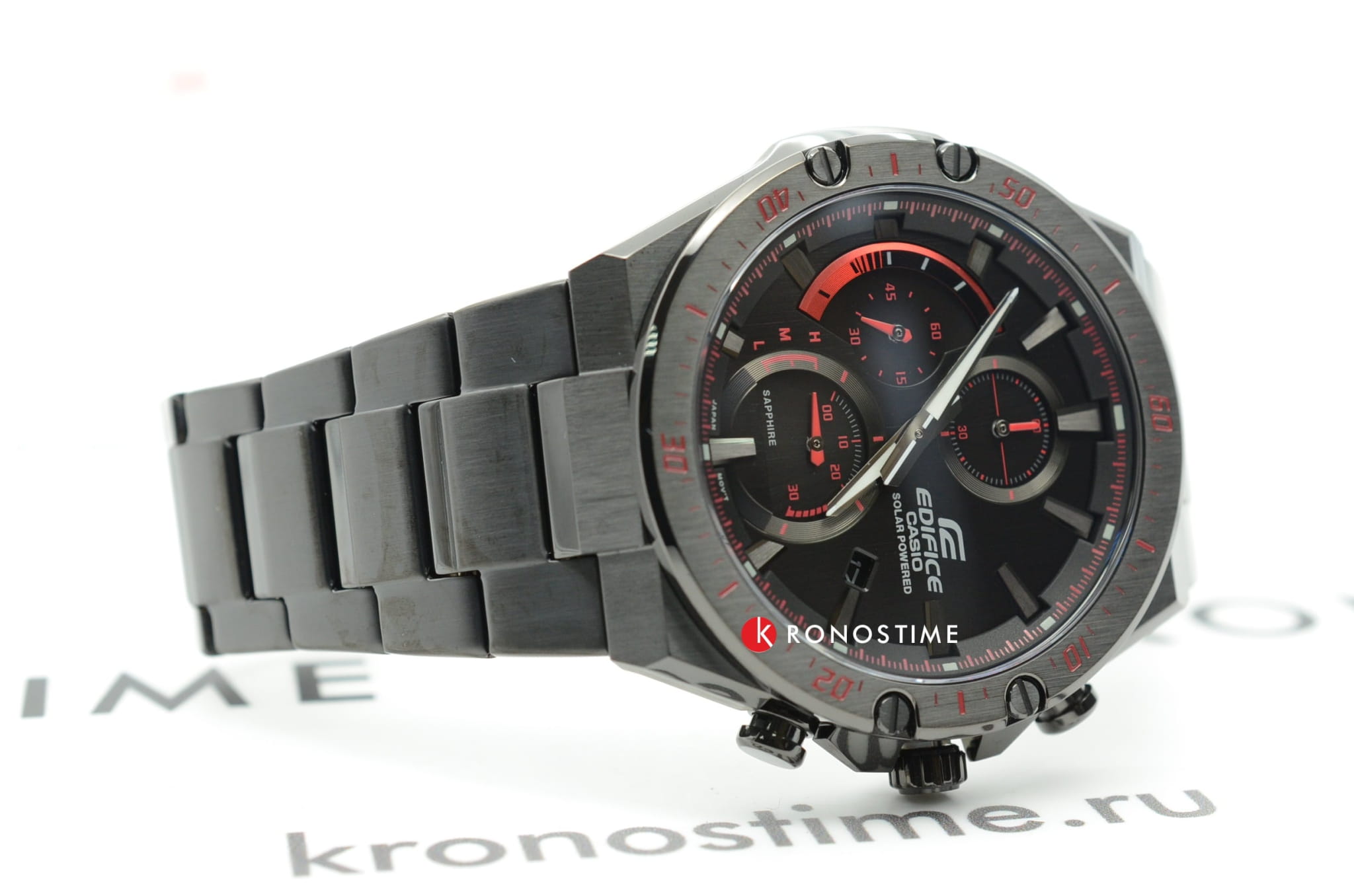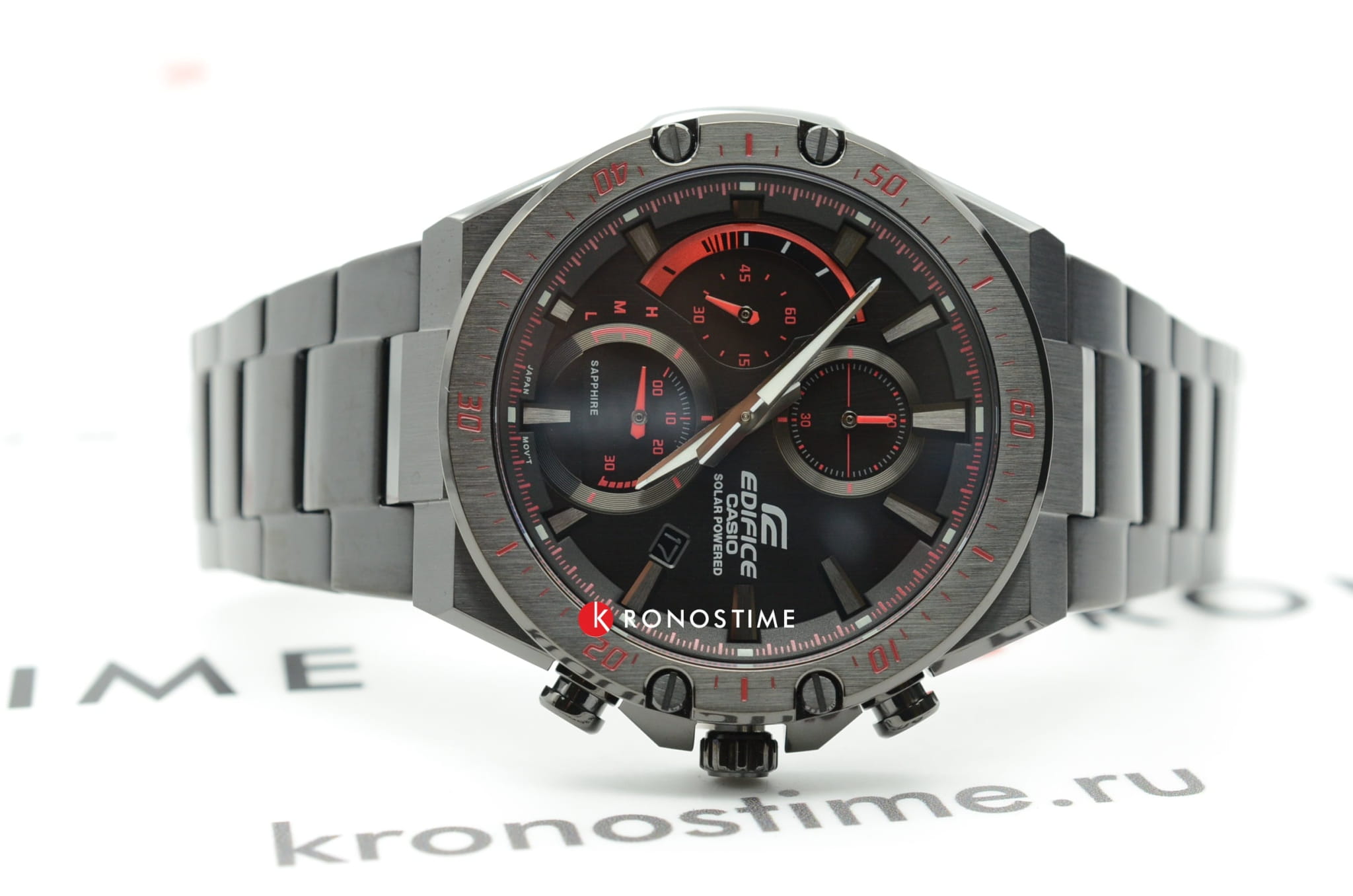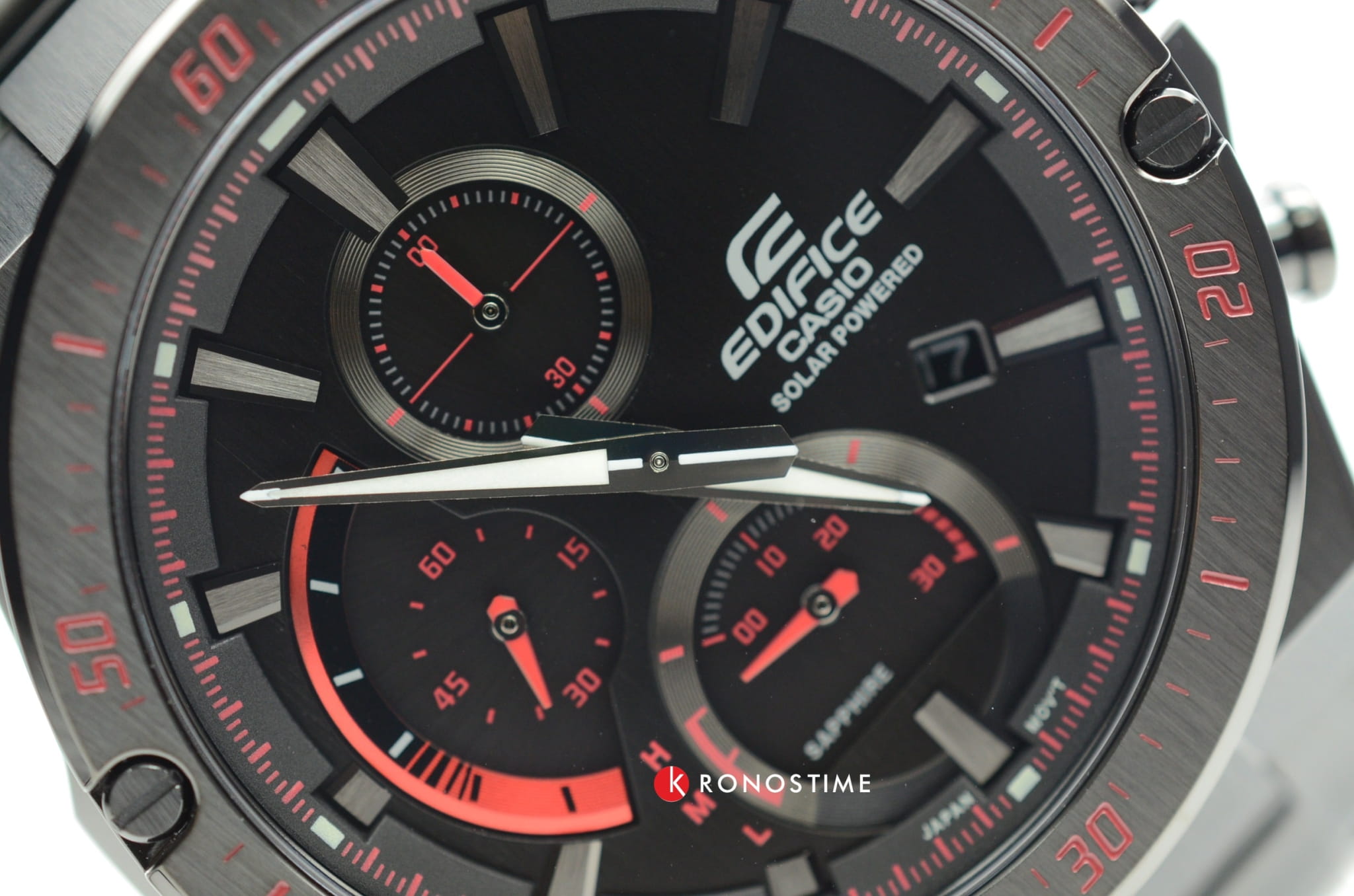 Наручные часы в чёрном исполнении привлекают красными деталями и лаконичным оформлением. Помогут идеально дополнить образ на каждый день. Аксессуар стал обладателем ультратонкого корпуса, по сравнению с большинством представителей Edifice – 9,9 мм. Модель изготовлена из стали 316L с ионным IP-покрытиемIP-покрытиеМетод ионного напыления. Демонстрирует повышенную устойчивость к истиранию, окислению и химическим веществам. Под воздействием высокого давления и температуры около 1500°C молекулы металла надёжно соединяются с частицами корпуса часов., материал устойчив к коррозии и механическим воздействиям. Японский кварцевый механизм обеспечивает питанием солнечная батарейка . Указатель минутной стрелки хронографаХронографФункция позволяет измерять отрезки времени с особой точностью: часы, минуты, секунды. Верным признаком хронографа является наличие на циферблате 3 дополнительных окошек-счётчиков. на секторной части циферблата. Сапфировое стекло с антибликовым покрытием. Водостойкость 100 метров. Люминесцентная подсветкаЛюминесцентное покрытиеПозволяет считывать показания времени в темноте. Производители наносят на стрелки, часовые индексы, безель или поверхность циферблата светонакопительный состав, дающий холодное свечение.. Застёжка с системой блокировки. Секундомер, отображение числа. Габариты: 50,2 x 45,4 x 9,9 мм.