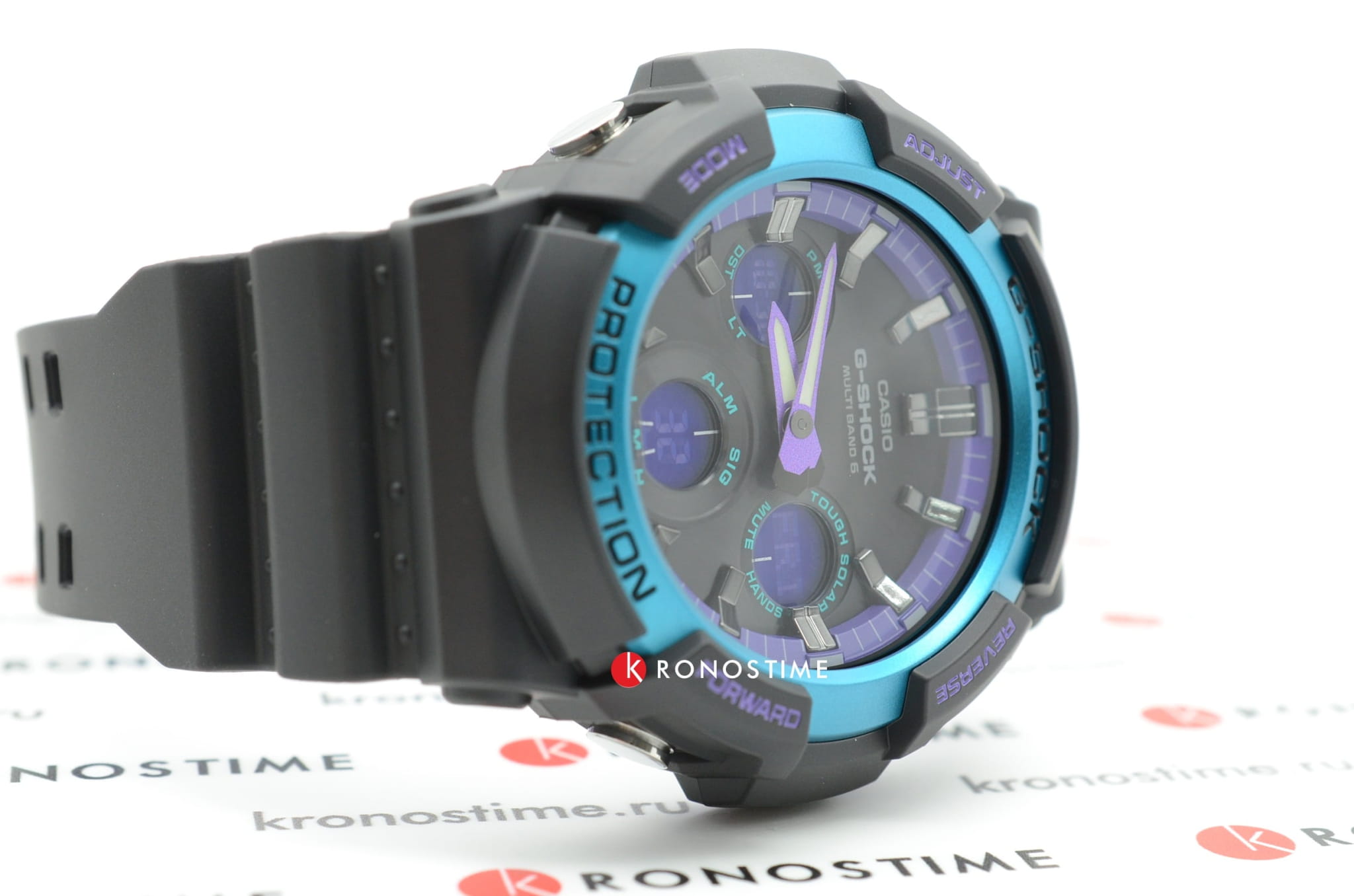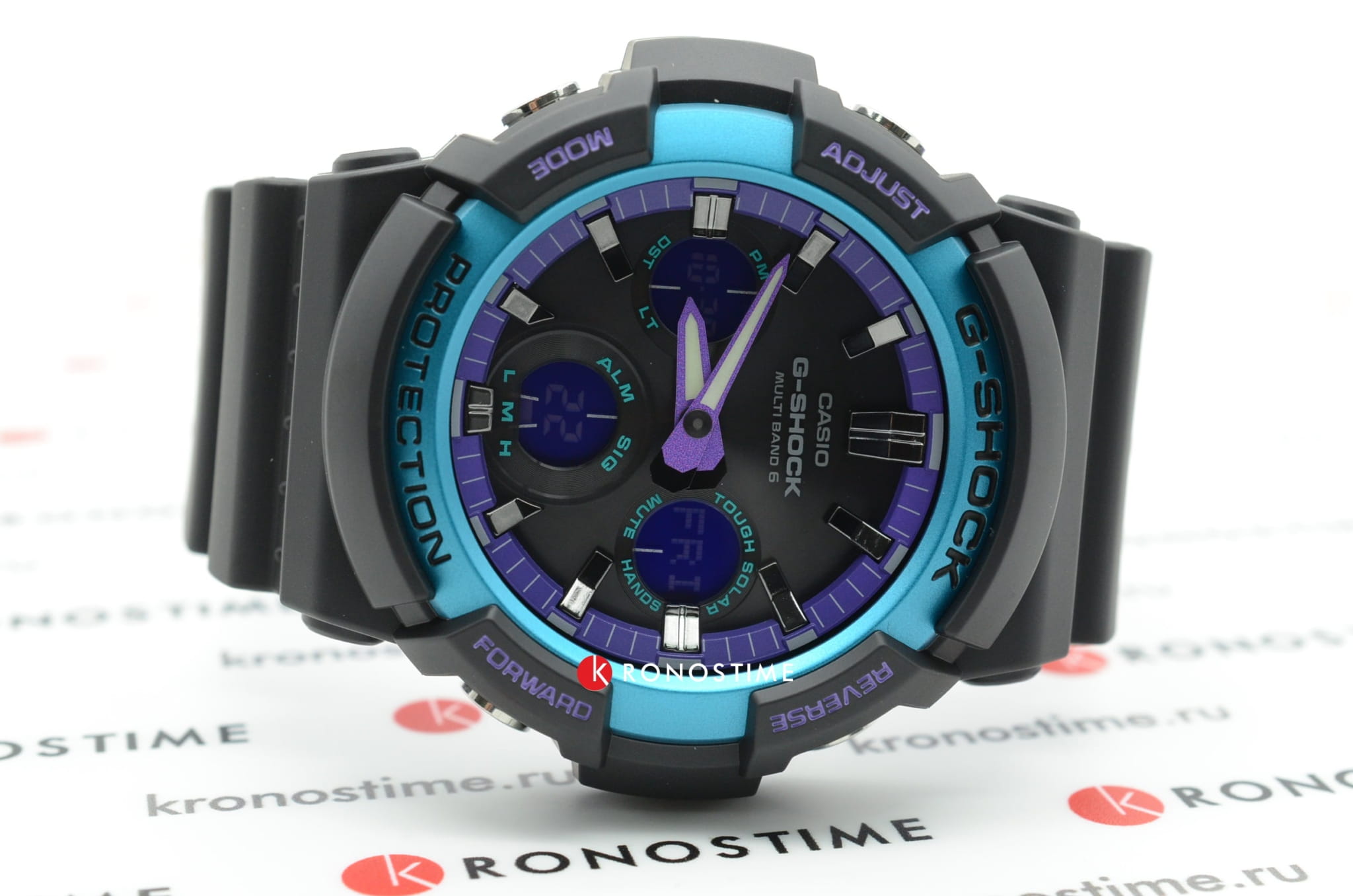 Основным цветом стал чёрный, на тёмном фоне отлично смотрятся фиолетовые и голубые детали. При создании модели дизайнеры вдохновлялись атмосферой ночных клубов, где часто проводят время молодые люди. Аксессуар имеет противоударный корпусУдаропрочный корпусМеханизм заключён в корпус, выполненный из современных материалов, устойчивых к ударам, механическим повреждениям и падению с высоты: инновационный пластик, карбон, нержавеющая сталь, титан., устойчивый к ударам и вибрации. Он надёжно защищает японский кварцевый механизм с точностью хода -/+ 15 секунд в месяц. БезельБезельВнешний ободок, закрепляющий стекло. В спортивных часах так называется поворотное кольцо с делениями на циферблате, выполняет роль таймера – замеряет отрезки времени на шкале. Неподвижный безель – элемент декора. Однонаправленно вращающийся безель на дайверских часах позволяет фиксировать моменты погружения и выныривания на поверхность. с цветным IP-покрытиемIP-покрытиеМетод ионного напыления. Демонстрирует повышенную устойчивость к истиранию, окислению и химическим веществам. Под воздействием высокого давления и температуры около 1500°C молекулы металла надёжно соединяются с частицами корпуса часов.. Прочное минеральное стекло. Технология . Автоматическая светодиодная подсветкаСветодиодная подсветкаСветодиодная или LED-подсветка обеспечивает появление яркого холодного свечения за счёт LED-элементов - маленьких лампочек. Они потребляют минимальное количество энергии, чаще всего можно встретить 1 светодиод, в нижней части циферблата., стрелки с люминесцентным покрытиемЛюминесцентное покрытиеПозволяет считывать показания времени в темноте. Производители наносят на стрелки, часовые индексы, безель или поверхность циферблата светонакопительный состав, дающий холодное свечение.. Минеральное стекло. Водозащита до 200 метров. Браслет из полимерного материала. Функция перемещения стрелок для лёгкого доступа к показаниям с цифровых мини-дисплеев. ХронографХронографФункция позволяет измерять отрезки времени с особой точностью: часы, минуты, секунды. Верным признаком хронографа является наличие на циферблате 3 дополнительных окошек-счётчиков., таймер обратного отсчёта, мировое времяМировое время Полезное часовое усложнение, отображающее время в основных городах и известных областях по всему миру, оно связано с часовыми поясами, удобно для путешественников и бизнесменов. , будильник, приём радиосигнала для калибровки времени, календарь, секундомер. Габариты: 55,1 x 52,5 x 16,7 мм.
