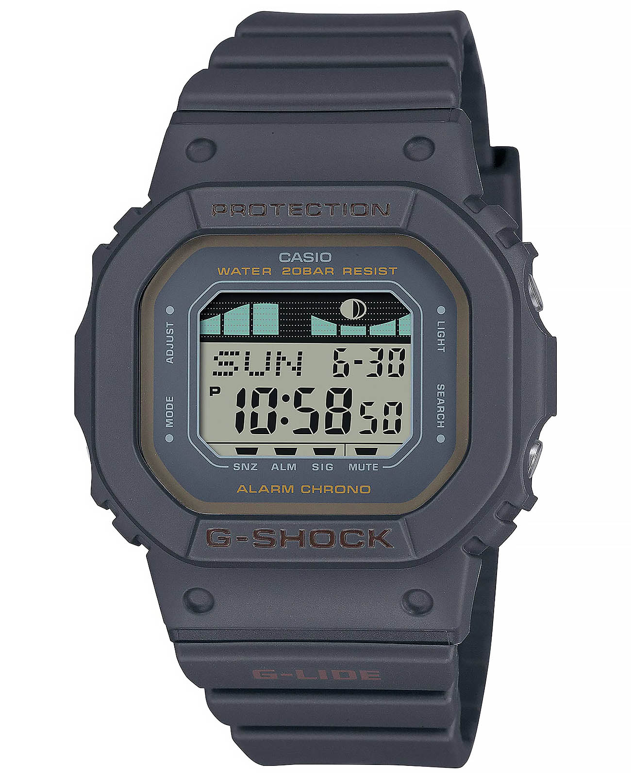 Японские мужские часы-хронографХронографФункция позволяет измерять отрезки времени с особой точностью: часы, минуты, секунды. Верным признаком хронографа является наличие на циферблате 3 дополнительных окошек-счётчиков. Casio G-Shock GLX-S5600-1 из коллекции G-Shock. Винтажная модель в новой цветовой гамме корпуса и ремешка понравится поклонникам серфинга. G-Lide. Модель часов создана на базе GLX-5600. Минеральное стеклоМинеральное стеклоМинеральное стекло представляет собой искусственно выращенный минерал кварца. Такое стекло отличается особой устойчивостью к повреждениям и царапинам. Уступает по некоторым качествам сапфировому стеклу. устойчивое к появлению царапин, обладающее высокой прозрачностью. Ударопрочный корпусУдаропрочный корпусМеханизм заключён в корпус, выполненный из современных материалов, устойчивых к ударам, механическим повреждениям и падению с высоты: инновационный пластик, карбон, нержавеющая сталь, титан. защищает механизм от ударов и вибрации. Электролюминесцентная подсветкаЭлектролюминесцентная подсветкаЭлектролюминесцентная панель устанавливается под ЖК-экраном часов, при нажатии кнопки электричество преобразуется в свет за счёт подачи напряжения на атомы фосфора, такой тип подсветки позволяет освещать весь циферблат. освещает весь циферблат. Мировое времяМировое время Полезное часовое усложнение, отображающее время в основных городах и известных областях по всему миру, оно связано с часовыми поясами, удобно для путешественников и бизнесменов. – 48 городов (29 часовых поясов). СекундомерСекундомерСекундоме́р — прибор, способный измерять интервалы времени с точностью до долей секунды. с точностью измерения 1/100 секунды и измерением до 23 часов 59 минут 59,99 cек. ТаймерТаймерОтсчитывает секунды в обратном направлении в заданном интервале времени. обратного отсчета (диапазон времени 24 часа), автоматический календарь, 12/24 отображение времени. 3 будильникаБудильникБуди́льник — часы, в заданный момент времени подающие звуковой, световой и/или в редких случаях другой сигнал., один с функцией Snooze, ежечасный сигнал. Отображение возраста и фазы Луны. Графическое отображение сведений о приливах и отливах на заданную дату и время. Класс водозащиты: 200 метров, позволит плавать, нырять и заниматься другими водными видами спорта. Ремешок из полимерного материала на стандартной застежке.
