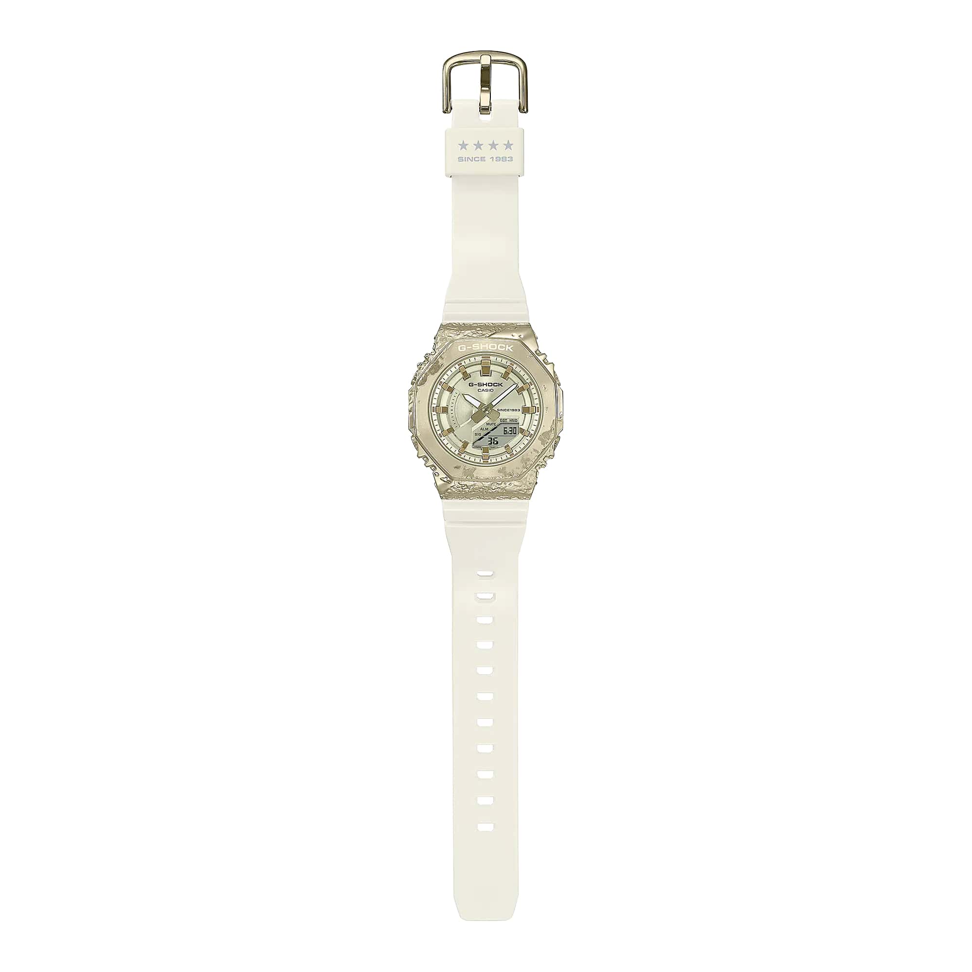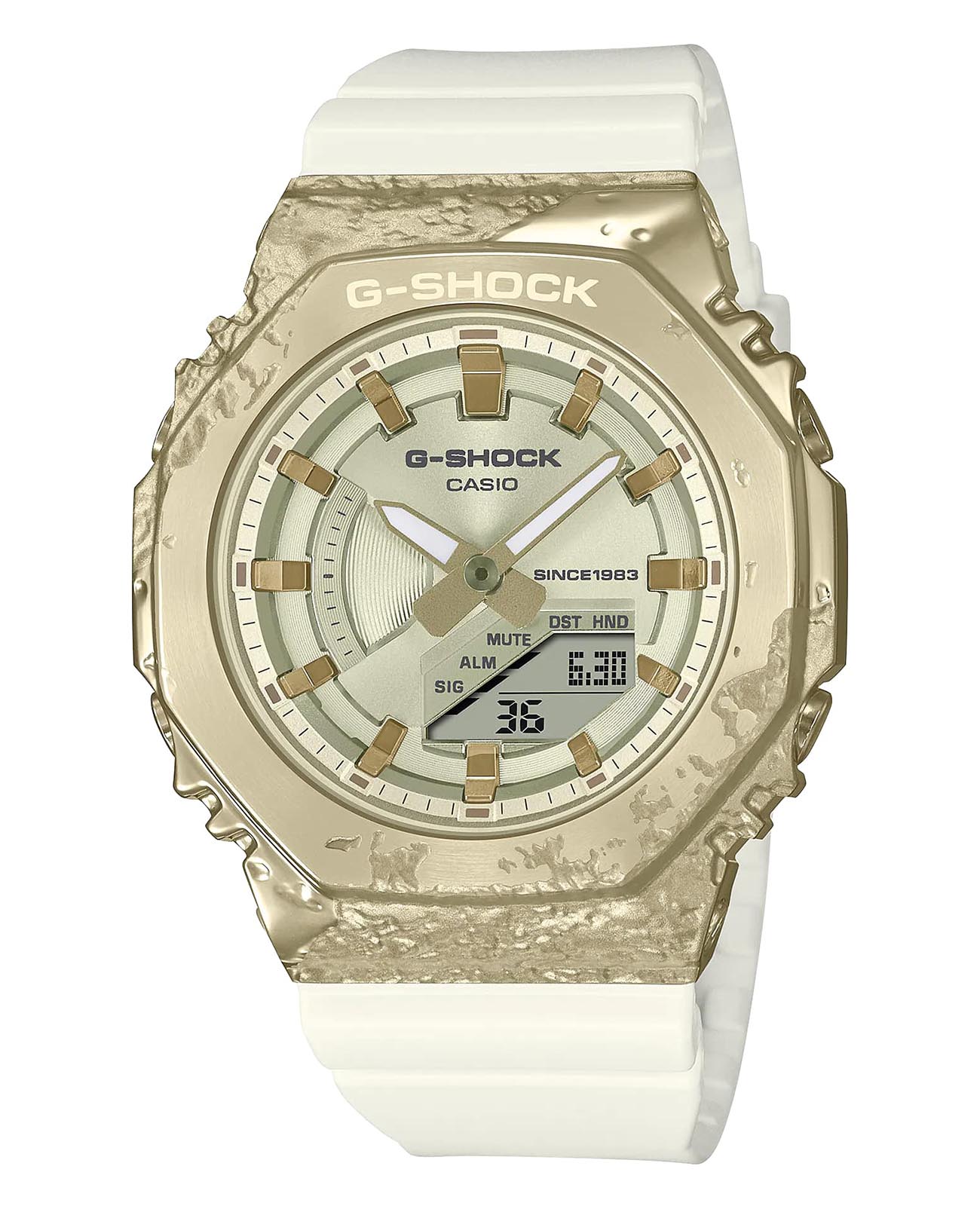 Японские унисекс часы с двойной подсветкой Casio G-Shock GM-S2140GEM-9A, кварцевый механизм с высокой точностью. Класс водозащиты: 200 метров, позволит плавать, нырять и заниматься другими водными видами спорта. Корпус часов изготовлен из пластика. Ударопрочные модели 40th anniversary Adventurer's Stone вдохновлены камнями, известными искателям приключений как полезные компасы со времен средневековья. Концепция непрерывных инноваций бренда G-SHOCK вдохновляет людей на решение новых задач, и дизайн этой линии основан на ценности, которую эти камни всегда имели для людей, ищущих приключений. Эта модель начинается с GM-S2100 и включает в себя дизайн, вдохновленный кальцитом желтого золота. БезельБезельВнешний ободок, закрепляющий стекло. В спортивных часах так называется поворотное кольцо с делениями на циферблате, выполняет роль таймера – замеряет отрезки времени на шкале. Неподвижный безель – элемент декора. Однонаправленно вращающийся безель на дайверских часах позволяет фиксировать моменты погружения и выныривания на поверхность. покрыт IP-покрытиемIP-покрытиеМетод ионного напыления. Демонстрирует повышенную устойчивость к истиранию, окислению и химическим веществам. Под воздействием высокого давления и температуры около 1500°C молекулы металла надёжно соединяются с частицами корпуса часов. из золота, а напыление из паровой фазы придает циферблату и часовым меткам аналогичный цвет, воссоздающий прозрачный желтый цвет этой формы кальцита. СекундомерСекундомерСекундоме́р — прибор, способный измерять интервалы времени с точностью до долей секунды. с точностью показаний 1/100с. Сплит-хронографСплит-хронографИспользуется для измерения продолжительности нескольких временных отрезков, начинающихся одновременно, а заканчивающихся в разное время.. ТаймерТаймерОтсчитывает секунды в обратном направлении в заданном интервале времени.обратного отсчета от 1мин до 24ч с автоповтором. Мировое времяМировое время Полезное часовое усложнение, отображающее время в основных городах и известных областях по всему миру, оно связано с часовыми поясами, удобно для путешественников и бизнесменов. : 29 часовых поясов (48 городов + координированное универсальное время), включение/выключение перехода на летнее время, переключение городов домашнего/мирового времени.