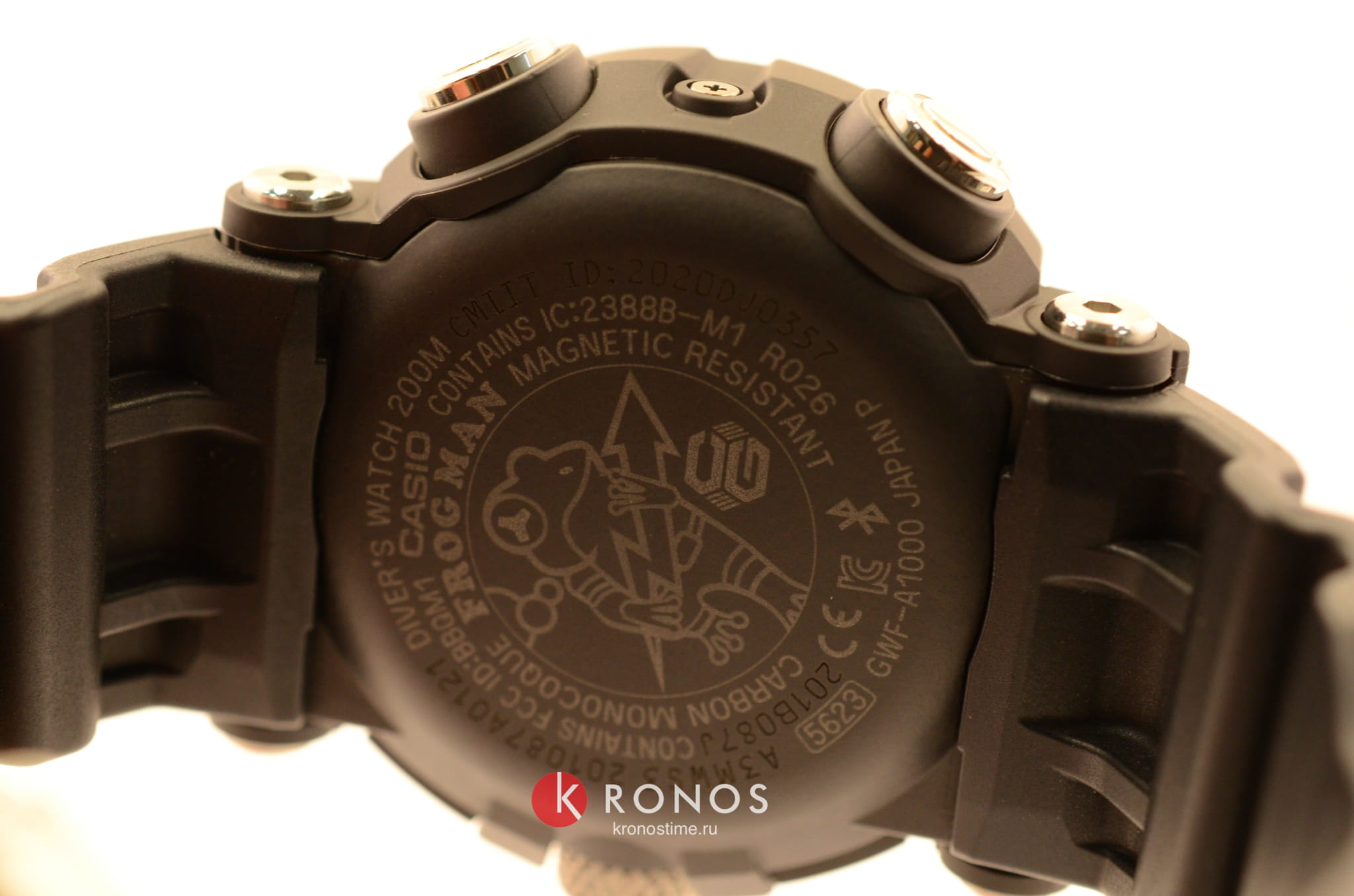 Карбоновый корпус и задняя поверхность часов представляют собой единую монолитную конструкцию. Выпуклое стекло часов спрессовано с металлическим кольцом, которое надежно крепится к корпусу шестью винтами, что обеспечивает высокую прочность часов и повышенную водостойкость. Также водостойкость обеспечивается тройными прокладками на стержнях кнопок.