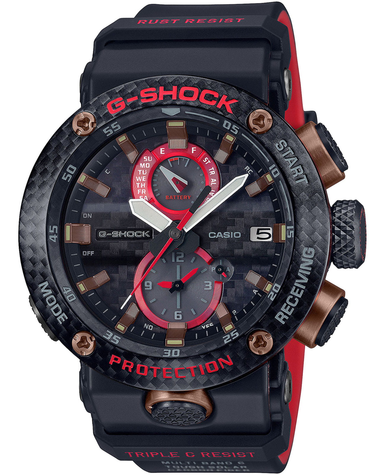 Внушительный аксессуар стильно смотрится на широком запястье, гармонично смотрятся крупные детали в красном и бронзовом цвете. Задняя крышка здесь отсутствует, ударопрочный корпусУдаропрочный корпусМеханизм заключён в корпус, выполненный из современных материалов, устойчивых к ударам, механическим повреждениям и падению с высоты: инновационный пластик, карбон, нержавеющая сталь, титан. сделан из монолитного углеродного монокока, вдохновлённого конструкцией ранних самолётов. Он состоит из 52 карбоновых слоёв, уникальная текстура просматривается на боковых частях безеляБезельВнешний ободок, закрепляющий стекло. В спортивных часах так называется поворотное кольцо с делениями на циферблате, выполняет роль таймера – замеряет отрезки времени на шкале. Неподвижный безель – элемент декора. Однонаправленно вращающийся безель на дайверских часах позволяет фиксировать моменты погружения и выныривания на поверхность. – с успехом реализована технология Carbon Core GuardCarbon Core Guard Новейшая структура корпуса, разработанная Casio. Полиуретановая пластина дополнительно усилена карбоновыми вставками, что придаёт специальную защиту от механических повреждений. Карбон отличается лёгкостью и прочностью.. Полимерный ремешок тоже имеет усиление карбоновыми волокнами. Наручные часы обладают полезным функционалом: BluetoothBluetoothСовременная технология, позволяющая синхронизировать часы с телефоном и переносить данные. Часы с Bluetooth расширяют возможности вашего смартфона и делают его использование ещё более удобным., будильник, мировое времяМировое время Полезное часовое усложнение, отображающее время в основных городах и известных областях по всему миру, оно связано с часовыми поясами, удобно для путешественников и бизнесменов. , таймер, приём радиосигнала, питание от солнечной батареи . Сапфировое стекло с антибликовой обработкой. Яркая люминесцентная подсветкаЛюминесцентное покрытиеПозволяет считывать показания времени в темноте. Производители наносят на стрелки, часовые индексы, безель или поверхность циферблата светонакопительный состав, дающий холодное свечение.. Габариты: 50,1 x 46,4 x 16,9 мм.