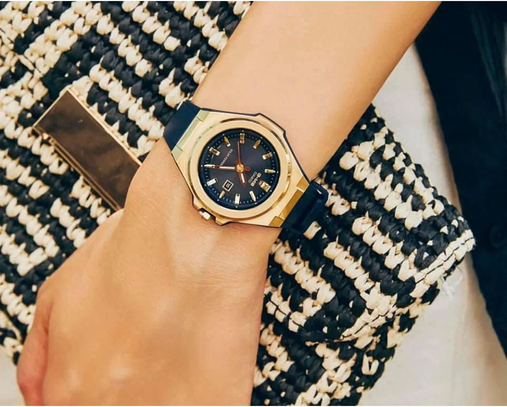 Модель сочетает несколько вариаций золотого: металлизированные стрелки, индексы, заводная головка. Такое исполнение поможет девушкам, ведущим активный образ жизни, не забывать о своей женственной натуре. Наручные часы реализуют технологию Tough SolarTough SolarТехнология основана на подзарядке аккумулятора от источника солнечного света, специальная панель улавливает солнечные лучи и преобразует их в энергию для работы часов. Достаточно пары минут нахождения на солнце для функционирования часов в течении суток., получая питание от солнца и искусственных источников света. При полностью зараженной батарейке японский кварцевый механизм способен проработать до 5 месяцев без подзарядки. Противоударный корпусУдаропрочный корпусМеханизм заключён в корпус, выполненный из современных материалов, устойчивых к ударам, механическим повреждениям и падению с высоты: инновационный пластик, карбон, нержавеющая сталь, титан. сделан из нержавеющей стали 316L, что позволяет не бояться последствий ударов, падения. Циферблат оснащён минеральным стеклом, оно отличается прочностью, устойчивостью к образованию царапин. Водостойкость до 10 бар. Стрелки покрыты светонакопительным люминесцентным составомЛюминесцентное покрытиеПозволяет считывать показания времени в темноте. Производители наносят на стрелки, часовые индексы, безель или поверхность циферблата светонакопительный состав, дающий холодное свечение.. На позиции 3 часов размещена апертура текущего числа. Габариты: 37,1 x 42,4 x 10,5 мм.