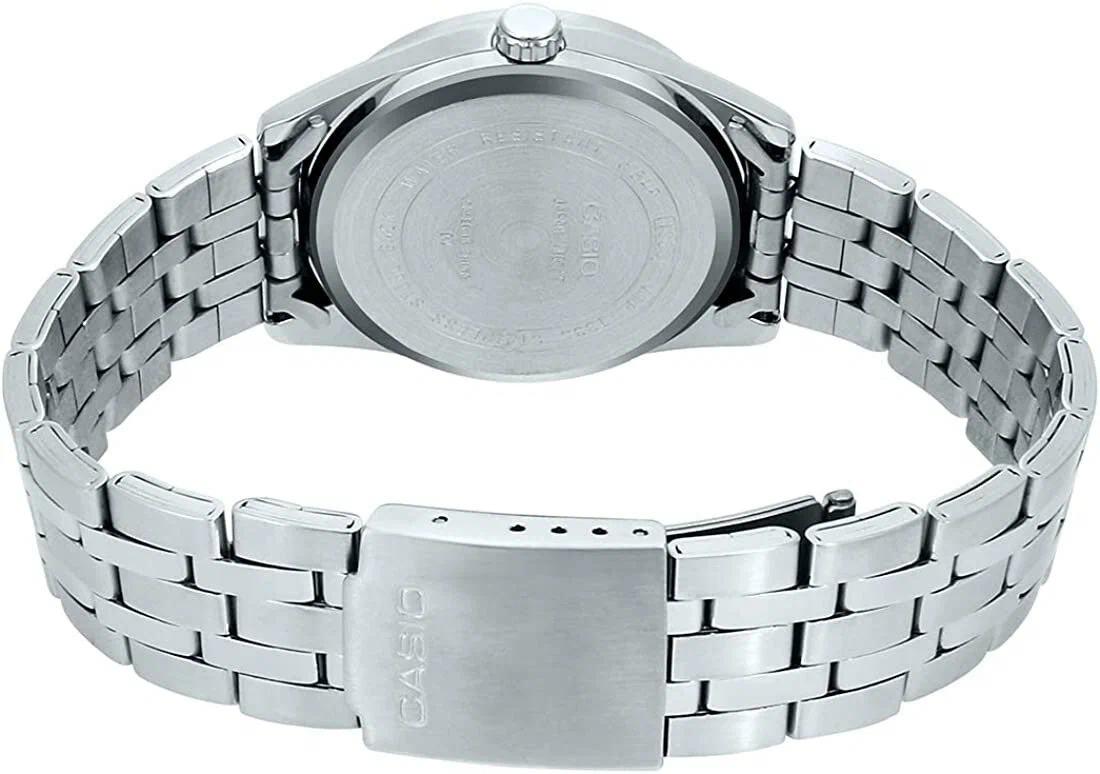 Японские мужские часы с минеральным стекломМинеральное стеклоМинеральное стекло представляет собой искусственно выращенный минерал кварца. Такое стекло отличается особой устойчивостью к повреждениям и царапинам. Уступает по некоторым качествам сапфировому стеклу. MTP-1335D-2A2, кварцевый механизм с высокой точностью. Класс водозащиты: 50 метров, позволит защитить корпус от случайных брызг или капель дождя. Корпус часов изготовлен из стали. Стальной браслет на раскладной застёжкеРаскладная застёжкаТакой тип застёжки используется только на браслетах из металла. Она никогда не раскрывается полностью, происходит разделение на 2 и более частей. Раскладывающая застёжка снизит вероятность потери часов к минимуму.. Стрелки с люминесцентным покрытиемЛюминесцентное покрытиеПозволяет считывать показания времени в темноте. Производители наносят на стрелки, часовые индексы, безель или поверхность циферблата светонакопительный состав, дающий холодное свечение.. Окошки дня недели и даты находятся в положении 3 часа.