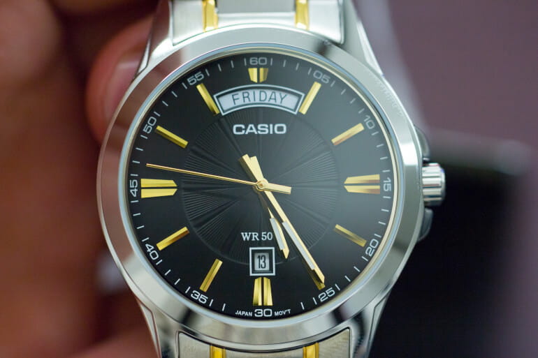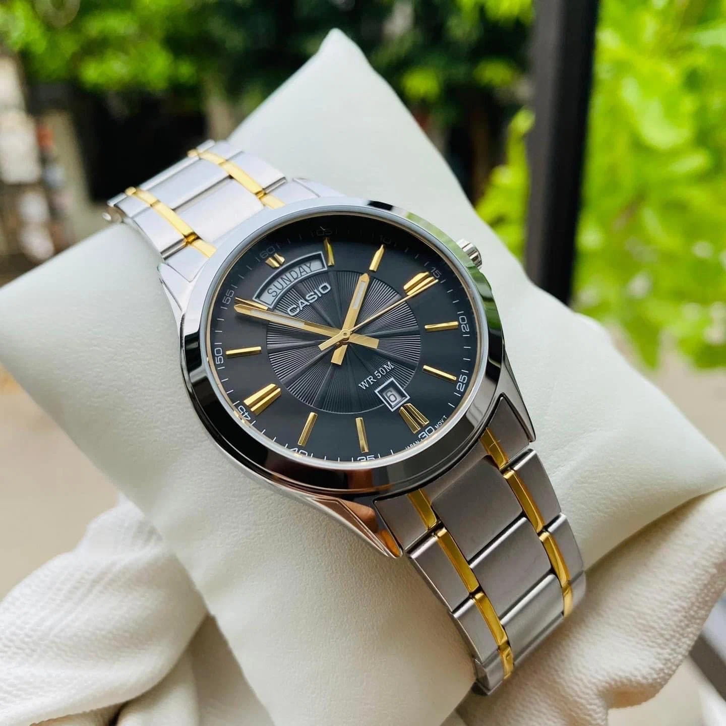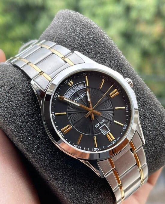 Японские мужские наручные часы с минеральным стекломМинеральное стеклоМинеральное стекло представляет собой искусственно выращенный минерал кварца. Такое стекло отличается особой устойчивостью к повреждениям и царапинам. Уступает по некоторым качествам сапфировому стеклу. Casio MTP-1381G-1A, кварцевый механизм с высокой точностью. Класс водозащиты: 50 метров, позволит защитить корпус от случайных брызг или капель дождя. Корпус часов изготовлен из стали. Стальной браслет на раскладной застёжкеРаскладная застёжкаТакой тип застёжки используется только на браслетах из металла. Она никогда не раскрывается полностью, происходит разделение на 2 и более частей. Раскладывающая застёжка снизит вероятность потери часов к минимуму. с IP-покрытиемIP-покрытиеМетод ионного напыления. Демонстрирует повышенную устойчивость к истиранию, окислению и химическим веществам. Под воздействием высокого давления и температуры около 1500°C молекулы металла надёжно соединяются с частицами корпуса часов.. Окошко даты находится в положении 6 часов.
