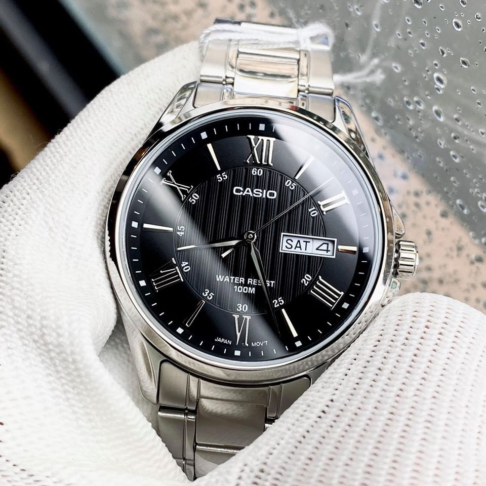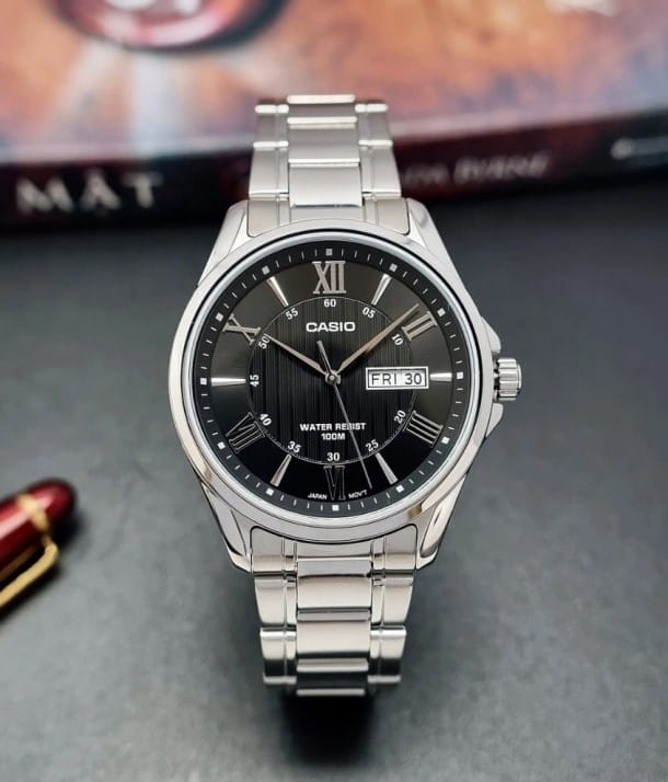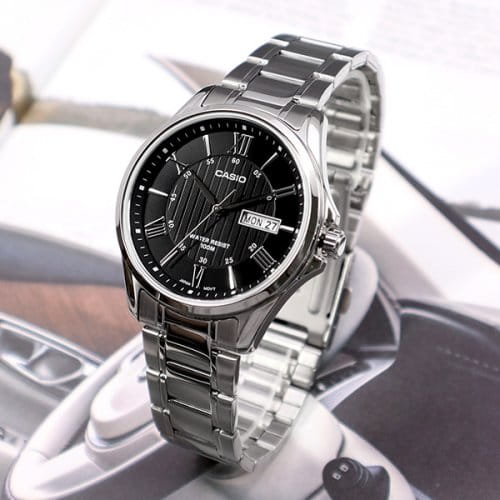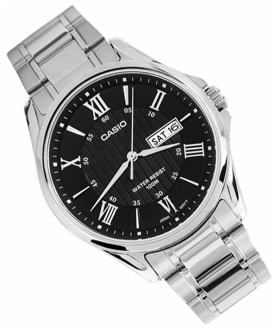 Японские мужские наручные часы с минеральным стекломМинеральное стеклоМинеральное стекло представляет собой искусственно выращенный минерал кварца. Такое стекло отличается особой устойчивостью к повреждениям и царапинам. Уступает по некоторым качествам сапфировому стеклу. Casio Collection MTP-1384D-1A, кварцевый механизм с высокой точностью. Класс водозащиты: 100 метров, позволит плавать, нырять и заниматься другими водными видами спорта. Корпус часов изготовлен из стали. Стальной браслет на раскладной застёжкеРаскладная застёжкаТакой тип застёжки используется только на браслетах из металла. Она никогда не раскрывается полностью, происходит разделение на 2 и более частей. Раскладывающая застёжка снизит вероятность потери часов к минимуму.. Окошки дня недели и даты находятся в положении 3 часа. Задняя крышка с винтовым фиксатором. Заводная головка с защитой.