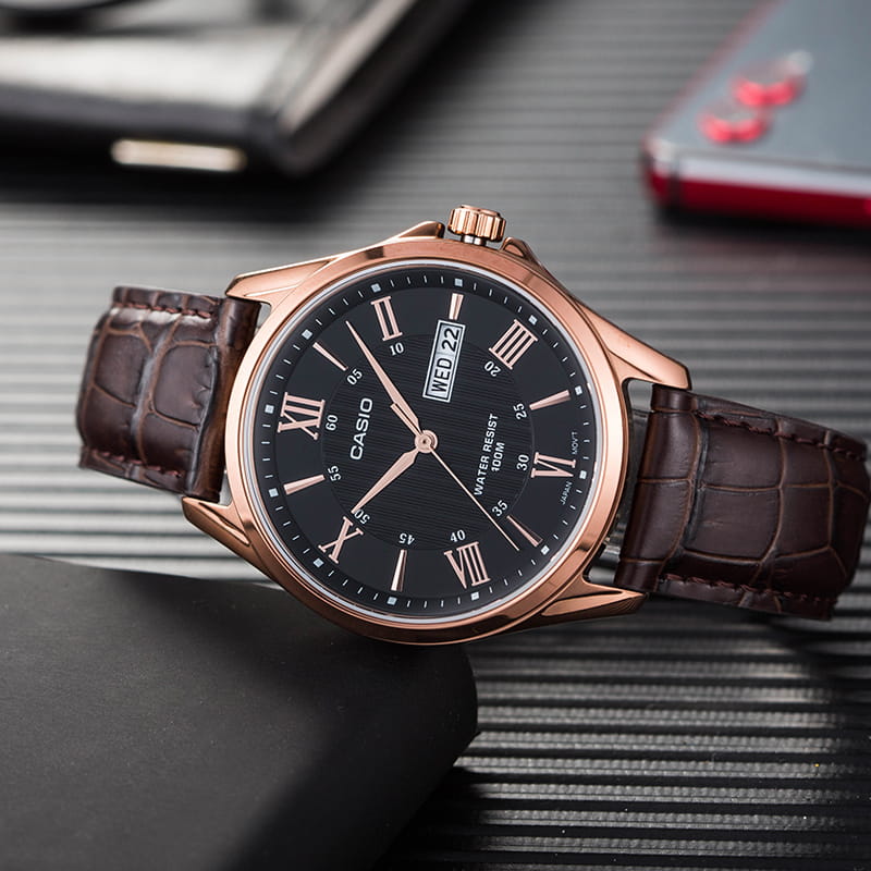 Японские мужские наручные часы с минеральным стекломМинеральное стеклоМинеральное стекло представляет собой искусственно выращенный минерал кварца. Такое стекло отличается особой устойчивостью к повреждениям и царапинам. Уступает по некоторым качествам сапфировому стеклу. Casio Collection MTP-1384L-1A, кварцевый механизм с высокой точностью. Класс водозащиты: 100 метров, позволит плавать, нырять и заниматься другими водными видами спорта. Корпус часов изготовлен из стали с IP-покрытиемIP-покрытиеМетод ионного напыления. Демонстрирует повышенную устойчивость к истиранию, окислению и химическим веществам. Под воздействием высокого давления и температуры около 1500°C молекулы металла надёжно соединяются с частицами корпуса часов.. Кожаный ремешок на стандартной застёжке. Окошки дня недели и даты находятся в положении 3 часа. Заводная головка с защитой. Задняя крышка с винтовым фиксатором.
