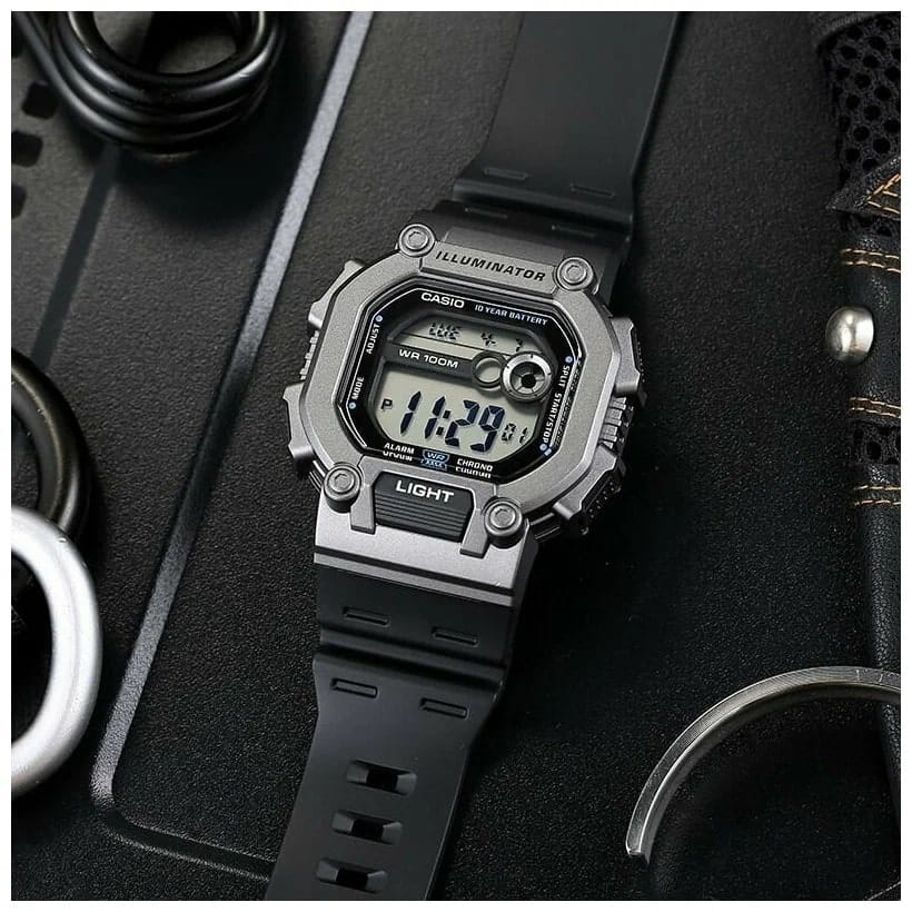 Японские мужские наручные часы Casio W-737H-1A2 c кварцевым механизмом высокой точности. Корпус часов изготовлен из пластика черного цвета. Функции: светодиодная подсветкаСветодиодная подсветкаСветодиодная или LED-подсветка обеспечивает появление яркого холодного свечения за счёт LED-элементов - маленьких лампочек. Они потребляют минимальное количество энергии, чаще всего можно встретить 1 светодиод, в нижней части циферблата., второй часовой пояс, секундомерСекундомерСекундоме́р — прибор, способный измерять интервалы времени с точностью до долей секунды., таймерТаймерОтсчитывает секунды в обратном направлении в заданном интервале времени., будильникБудильникБуди́льник — часы, в заданный момент времени подающие звуковой, световой и/или в редких случаях другой сигнал., автоматический календарь, 12/24 отображение времени. Органическое стекло, корпус и ремешок из полимерного пластика, водонепроницаемость (10 бар). Габариты (Ш x В x Г) 45,7 х 51,9 х 14. Вес 46 г.
