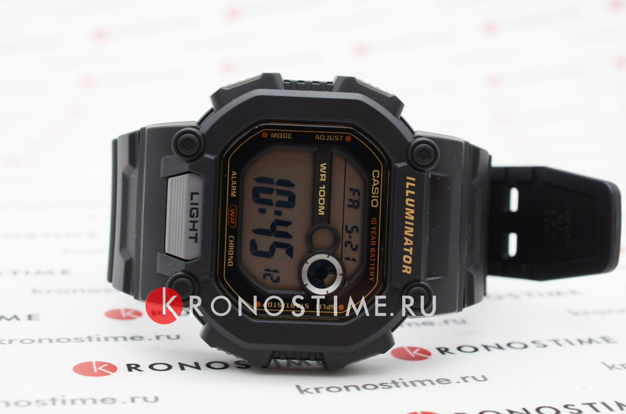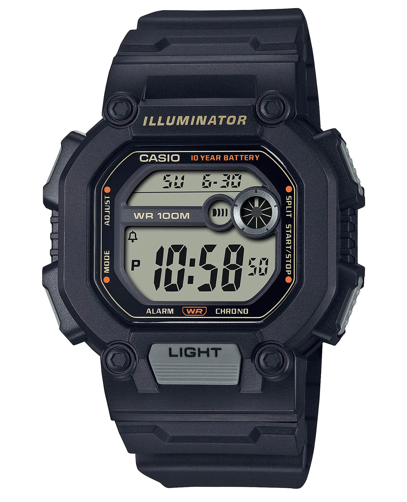 Спортивные мужские часы. Секундомер. Отображение времени в двух часовых поясах. Таймер. Будильник. Мировое время. Подсветка циферблата. Корпус - Пластиковый; Стекло - Пластик; Водозащита - 100 м. (WR 100); Материал ремешка - Пластиковый; Цвет ремешка - Черный; Цвет циферблата - Lcd.