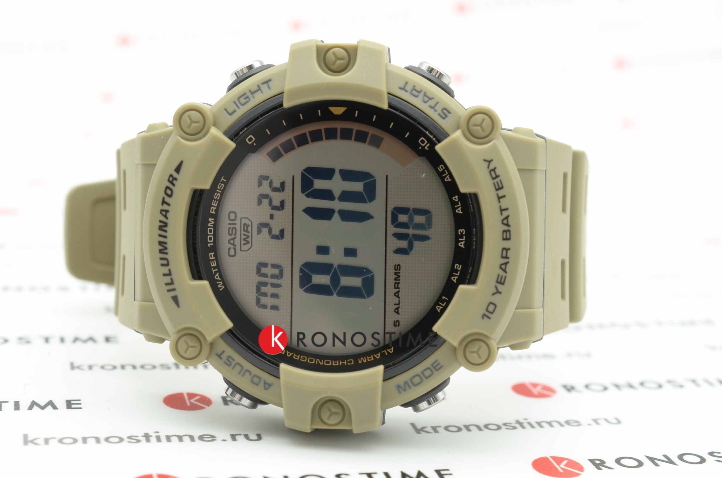 Электронные часы. Светодиодная подсветка. Функция секундомера с точностью 1/100 секунды и пределом измерения 24 часа. Таймер на 24 часа - время можно предварительно настроить от 1 секунды и до 100 часов. Часы могут затем автоматически начать отсчет в обратную сторону в установленное время. Идеальное решение для людей, которым необходимо ежедневно принимать лекарства или выполнять промежуточные упражнения (тренировки). 5 ежедневных будильников. Функция повтора будильника. Включение/выключение звука кнопок. Автоматический календарь. 12/24х часовой формат времени. Корпус выполнен из полимерного пластика бежевого цвета. Размер корпуса составляет 54 х 51 х 16 мм. Ремешок из полимерного материала, стандартная застежка. Акриловое стекло. Водостойкость WR 100 (плавание без погружения). Вес примерно 57 гр.