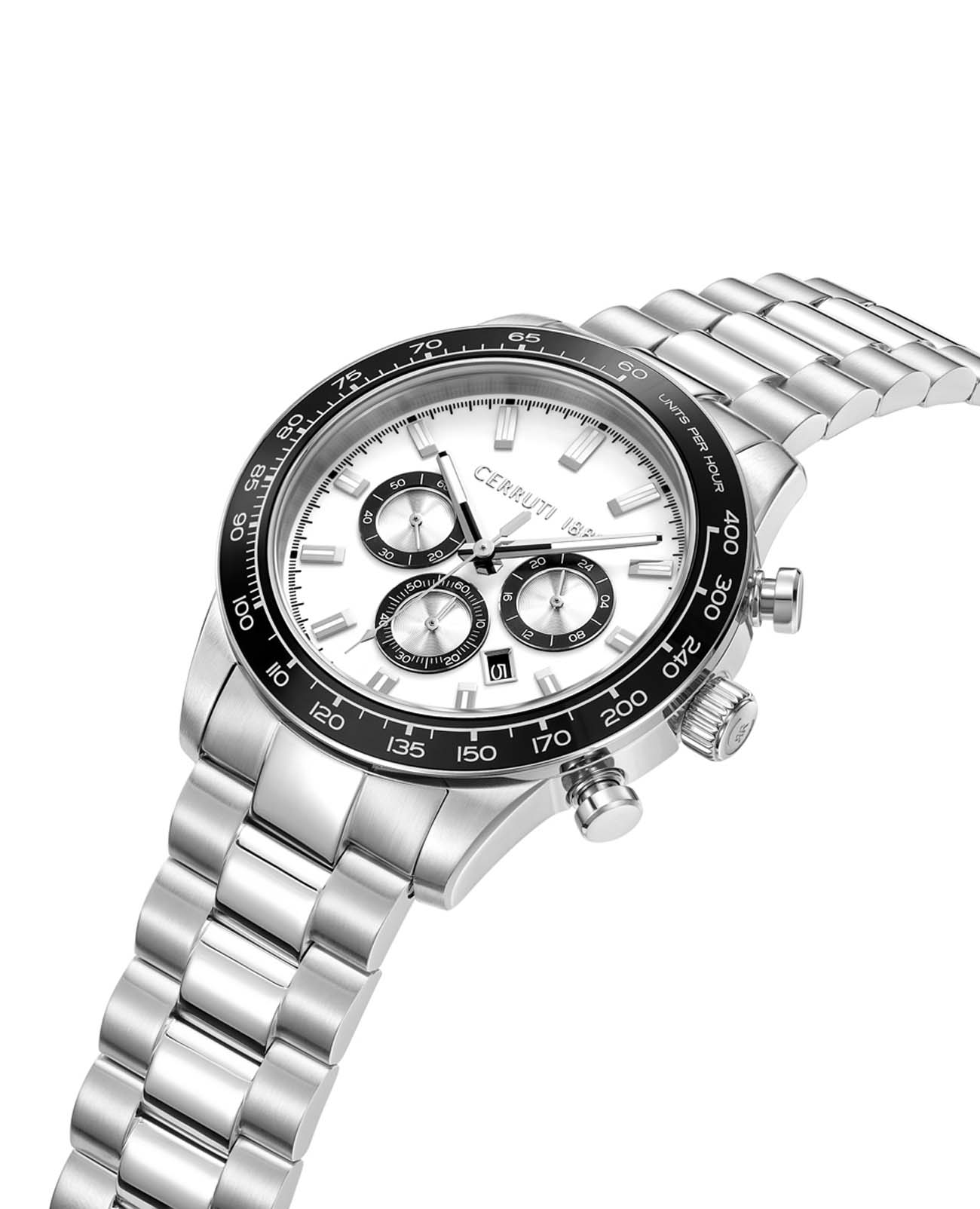 Французские мужские часы-хронографХронографФункция позволяет измерять отрезки времени с особой точностью: часы, минуты, секунды. Верным признаком хронографа является наличие на циферблате 3 дополнительных окошек-счётчиков. Cerruti 1881 Turchino CIWGI0028302, кварцевый механизм с высокой точностью. Минеральное стеклоМинеральное стеклоМинеральное стекло представляет собой искусственно выращенный минерал кварца. Такое стекло отличается особой устойчивостью к повреждениям и царапинам. Уступает по некоторым качествам сапфировому стеклу. устойчивое к мелким механическим повреждениям. Корпус часов изготовлен из стали. БезельБезельВнешний ободок, закрепляющий стекло. В спортивных часах так называется поворотное кольцо с делениями на циферблате, выполняет роль таймера – замеряет отрезки времени на шкале. Неподвижный безель – элемент декора. Однонаправленно вращающийся безель на дайверских часах позволяет фиксировать моменты погружения и выныривания на поверхность. из нержавеющей стали и кермики. Циферблат выполнен с метками в виде штрихов. Окошко даты находится в положении между 4 и 5 часами. Стрелки и метки с люминесцентным покрытиемЛюминесцентное покрытиеПозволяет считывать показания времени в темноте. Производители наносят на стрелки, часовые индексы, безель или поверхность циферблата светонакопительный состав, дающий холодное свечение.. Класс водозащиты: 100 метров, позволит плавать, нырять и заниматься другими водными видами спорта. Стальной на застёжке-бабочке с кнопкамиЗастёжка "бабочка"Такой вид застёжки дополняется предохранителями, помогающими избежать случайного раскрытия браслета. Обладают изящным исполнением. .