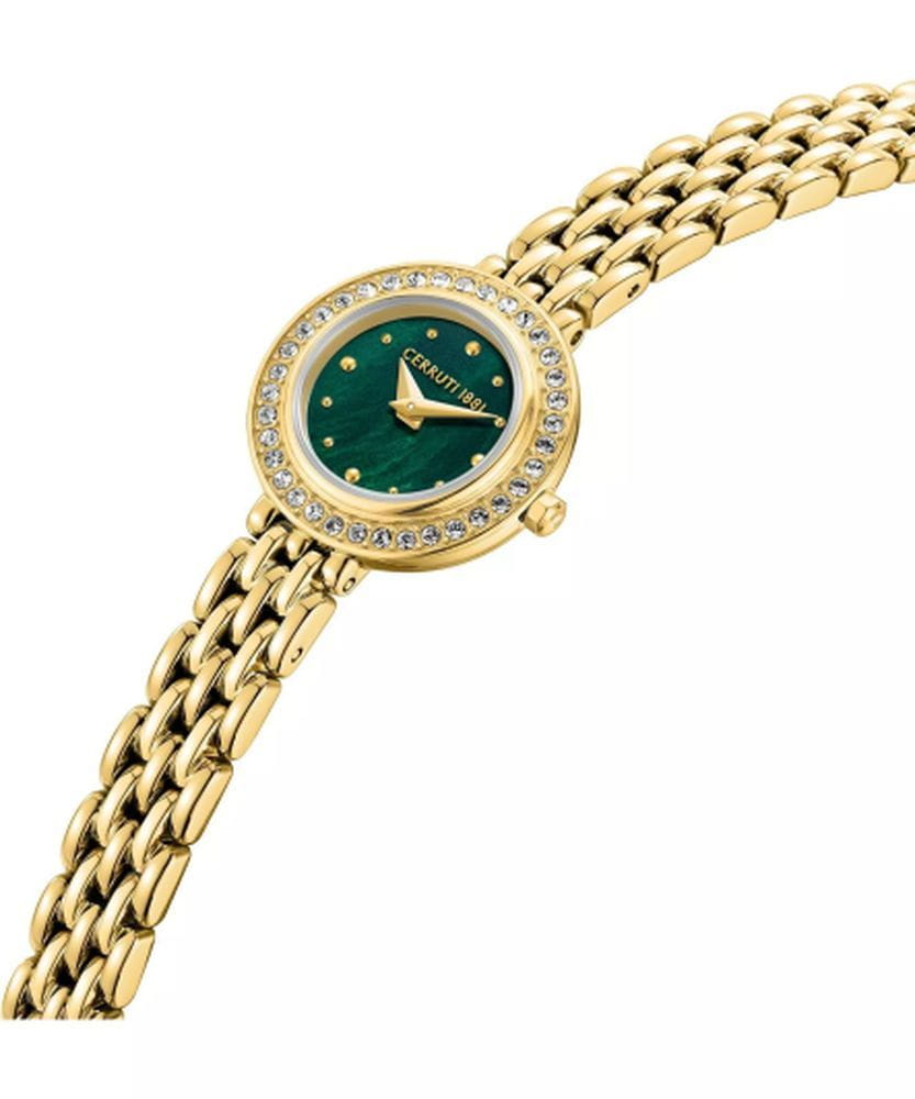 Cerruti 1881 CIWLG0073003 — изысканные женские часы, созданные в лучших традициях итальянской элегантности. Круглый корпус из нержавеющей стали с благородным золотым IP-покрытиемIP-покрытиеМетод ионного напыления. Демонстрирует повышенную устойчивость к истиранию, окислению и химическим веществам. Под воздействием высокого давления и температуры около 1500°C молекулы металла надёжно соединяются с частицами корпуса часов. и сияющим безелемБезельВнешний ободок, закрепляющий стекло. В спортивных часах так называется поворотное кольцо с делениями на циферблате, выполняет роль таймера – замеряет отрезки времени на шкале. Неподвижный безель – элемент декора. Однонаправленно вращающийся безель на дайверских часах позволяет фиксировать моменты погружения и выныривания на поверхность., украшенным кристаллами, придаёт модели утончённый и праздничный вид. Глубокий зелёный циферблат с солнечным переливом оформлен лаконично и стильно: миниатюрные метки в виде кристаллов подчёркивают ювелирный характер аксессуара. Прочное минеральное стеклоМинеральное стеклоМинеральное стекло представляет собой искусственно выращенный минерал кварца. Такое стекло отличается особой устойчивостью к повреждениям и царапинам. Уступает по некоторым качествам сапфировому стеклу. защищает поверхность от царапин, а металлический браслет с IP-покрытиемIP-покрытиеМетод ионного напыления. Демонстрирует повышенную устойчивость к истиранию, окислению и химическим веществам. Под воздействием высокого давления и температуры около 1500°C молекулы металла надёжно соединяются с частицами корпуса часов. полированными звеньями оснащён застёжкой «бабочка»Застёжка "бабочка"Такой вид застёжки дополняется предохранителями, помогающими избежать случайного раскрытия браслета. Обладают изящным исполнением. , обеспечивающей комфортное прилегание и надёжную фиксацию. Cerruti 1881 — это воплощение женственности и роскоши, идеально подходящее для тех, кто ценит утончённый стиль и блеск итальянской моды.