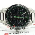 Брендовый аксессуар сразу притягивает внимание. Чёрный циферблат, дополненный зелёными элементами и функциональными окошками, отражает спортивную динамичность. Алюминиевый безельБезельВнешний ободок, закрепляющий стекло. В спортивных часах так называется поворотное кольцо с делениями на циферблате, выполняет роль таймера – замеряет отрезки времени на шкале. Неподвижный безель – элемент декора. Однонаправленно вращающийся безель на дайверских часах позволяет фиксировать моменты погружения и выныривания на поверхность. размечен шкалой тахиметраТахиметрРазмеченная шкала, располагается на ободке или безеле часов. Тахиметр позволяет рассчитать скорость на определённом участке пути, расстояние измеряется в километрах или милях.. Часы основаны на концепции Double SecurityDS ConceptDouble Security Concept, обозначает двойную надёжность и безупречную точность часов Certina. Двойная система защиты подразумевает обеспечение максимальной устойчивости к ударам и высоких показателей водонепроницаемости., что свидетельствует о высокой устойчивости к ударам и водонепроницаемости (до 10 бар) модели. Швейцарский кварцевый калибр ETA 251.264 Precidrive™Precidrive™Инновационный кварцевый механизм Certina. Часы, оснащённые этим швейцарским калибром, приравниваются к точности к сертифицированным хронометрам, точность хода составляет +/-10 секунд в год., измеряющий время с точностьюдо одной сотой секунды. Двухстороннее антибликовое покрытие для стекла из сапфира. Корпус и браслет из стали 316L с антикоррозионными свойствами. Задняя крышка с фирменной гравировкой. ХронографХронографФункция позволяет измерять отрезки времени с особой точностью: часы, минуты, секунды. Верным признаком хронографа является наличие на циферблате 3 дополнительных окошек-счётчиков., календарь, индикатор EOLEOLПредставляет собой систему, уведомляющую владельца часов о необходимости замены элемента питания. За 2 недели до полного разряда батарейки секундная стрелка перестаёт ходить чётко и начинает перепрыгивать на 3-4 деления., секундомер. Диаметр корпуса: 41 мм.