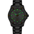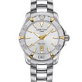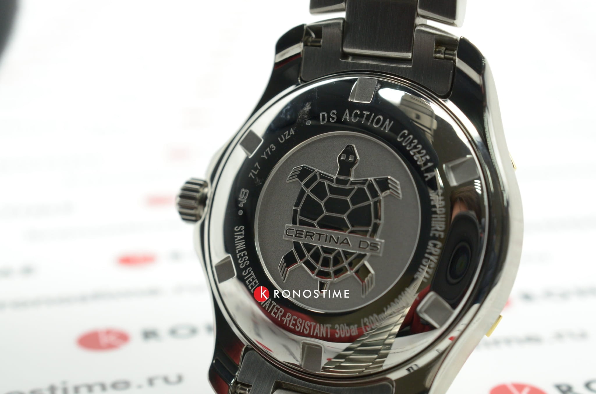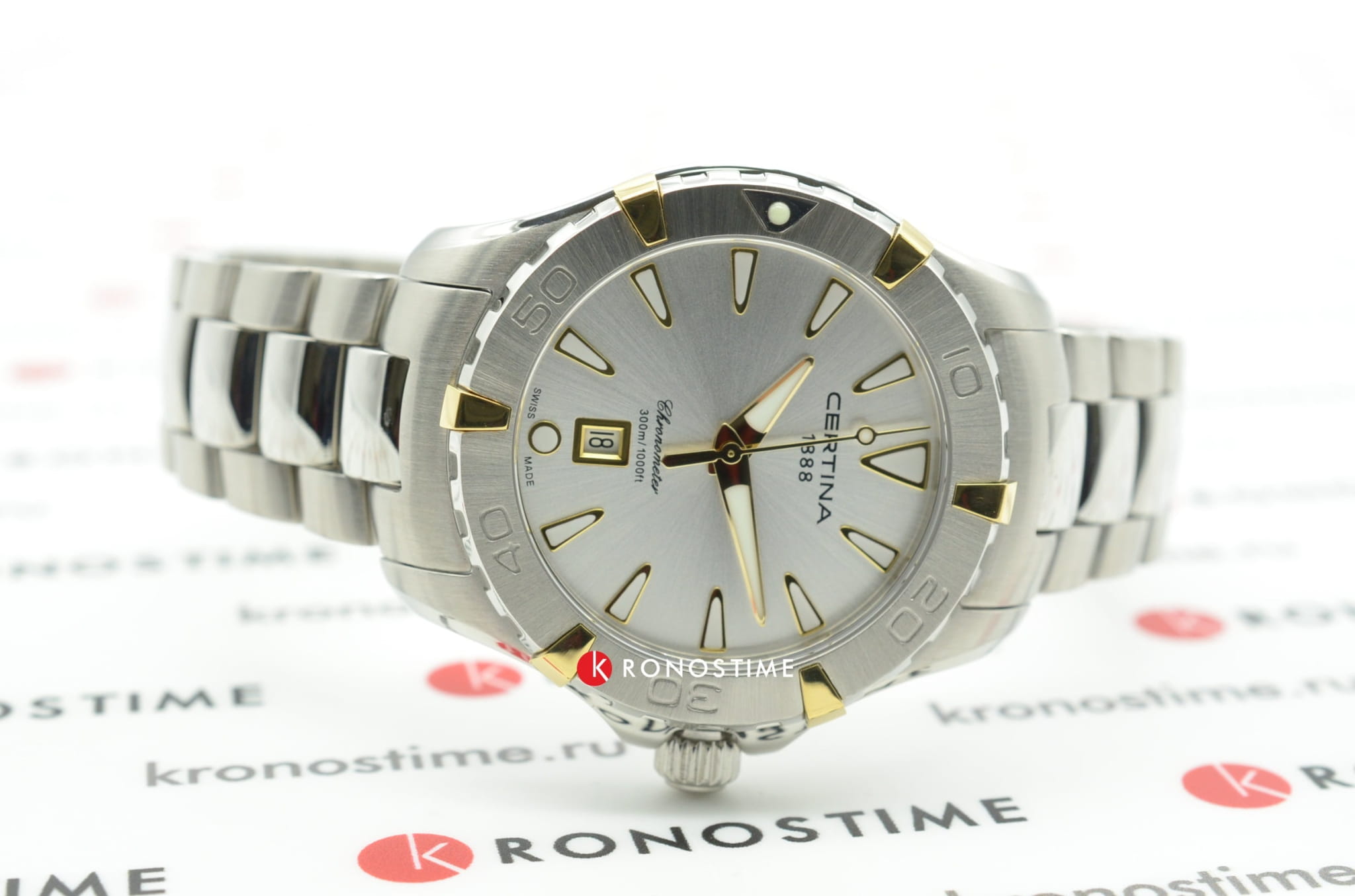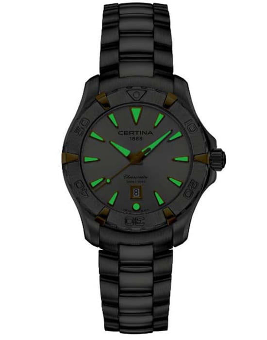 Компактный циферблат дополнен золотистыми элементами, показатели видны максимально чётко. Изящный аксессуар внутри просто «кремень», чему способствует система DS ConceptDS ConceptDouble Security Concept, обозначает двойную надёжность и безупречную точность часов Certina. Двойная система защиты подразумевает обеспечение максимальной устойчивости к ударам и высоких показателей водонепроницаемости.: водонепроницаемость 300 метров, завинчивающаяся задняя крышка и заводная головка с системой блокировки, сапфировое стекло, хирургическая сталь 316L. Швейцарский кварцевый механизм ETA F04.411 Precidrive™Precidrive™Инновационный кварцевый механизм Certina. Часы, оснащённые этим швейцарским калибром, приравниваются к точности к сертифицированным хронометрам, точность хода составляет +/-10 секунд в год. отмечен сертификатом хронометра COSCСертификат COSCОфициальный сертификат, подтверждающий то, что часы ходят с особо высокой точностью. Для получения документа часы подвергаются тестовым испытаниям, разработанным швейцарским институтом тестирования хронометров COSC. Допустимая норма для механических часов -4/+6 секунд в день, для кварцевых моделей +/- 0,07 секунд в день. за безупречную точность хода. Частичное PVD-покрытиеPVDУльтратонкое покрытие наносится в технике вакуумного напыления, сочетает в себе нитрид титана особой прочности со слоем золота или оксида хрома. Несёт в себе декоративную или защитную функцию.. Вращающийся безельБезельВнешний ободок, закрепляющий стекло. В спортивных часах так называется поворотное кольцо с делениями на циферблате, выполняет роль таймера – замеряет отрезки времени на шкале. Неподвижный безель – элемент декора. Однонаправленно вращающийся безель на дайверских часах позволяет фиксировать моменты погружения и выныривания на поверхность.. Яркая люминесцентная подсветкаЛюминесцентное покрытиеПозволяет считывать показания времени в темноте. Производители наносят на стрелки, часовые индексы, безель или поверхность циферблата светонакопительный состав, дающий холодное свечение.. Апертура даты, функция EOLEOLПредставляет собой систему, уведомляющую владельца часов о необходимости замены элемента питания. За 2 недели до полного разряда батарейки секундная стрелка перестаёт ходить чётко и начинает перепрыгивать на 3-4 деления.. Диаметр корпуса: 34 мм.