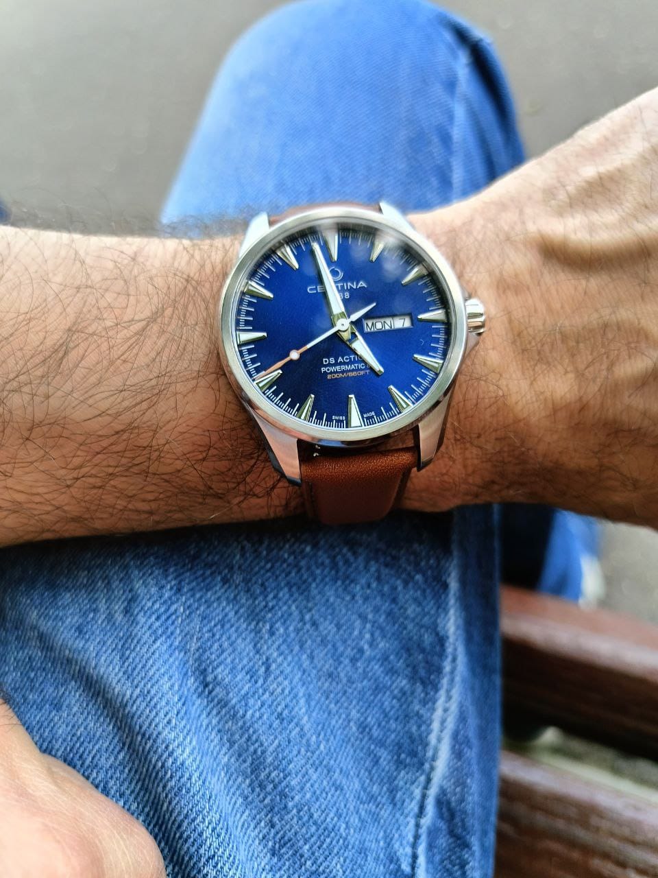 Это элегантная классика, которая безупречно дополнит повседневный, вечерний образ, поможет в создании делового имиджа. Ремешок из натуральной телячьей кожи сочетается с любой одеждой. Стальной ударопрочный корпусУдаропрочный корпусМеханизм заключён в корпус, выполненный из современных материалов, устойчивых к ударам, механическим повреждениям и падению с высоты: инновационный пластик, карбон, нержавеющая сталь, титан. защищает автоматический механизм ETA Powermatic 80Powermatic 80Эксклюзивный калибр от швейцарской компании ETA с увеличенным запасом хода до 80 часов за счёт удлинённой заводной пружины. Характеризуется улучшенной системой спуска со сниженным трением. производства Швейцарии, отличающийся резервом хода на 80 часов. Его работа отлично просматривается благодаря прозрачной задней крышке. Стекло из сапфира. Концепция DS ConceptDS ConceptDouble Security Concept, обозначает двойную надёжность и безупречную точность часов Certina. Двойная система защиты подразумевает обеспечение максимальной устойчивости к ударам и высоких показателей водонепроницаемости.. Водозащита WR 200. ЛюминесцентныеЛюминесцентное покрытиеПозволяет считывать показания времени в темноте. Производители наносят на стрелки, часовые индексы, безель или поверхность циферблата светонакопительный состав, дающий холодное свечение. стрелки и метки. Защита заводной головки. . Апертура даты и дня недели. Диаметр корпуса: 41 мм.