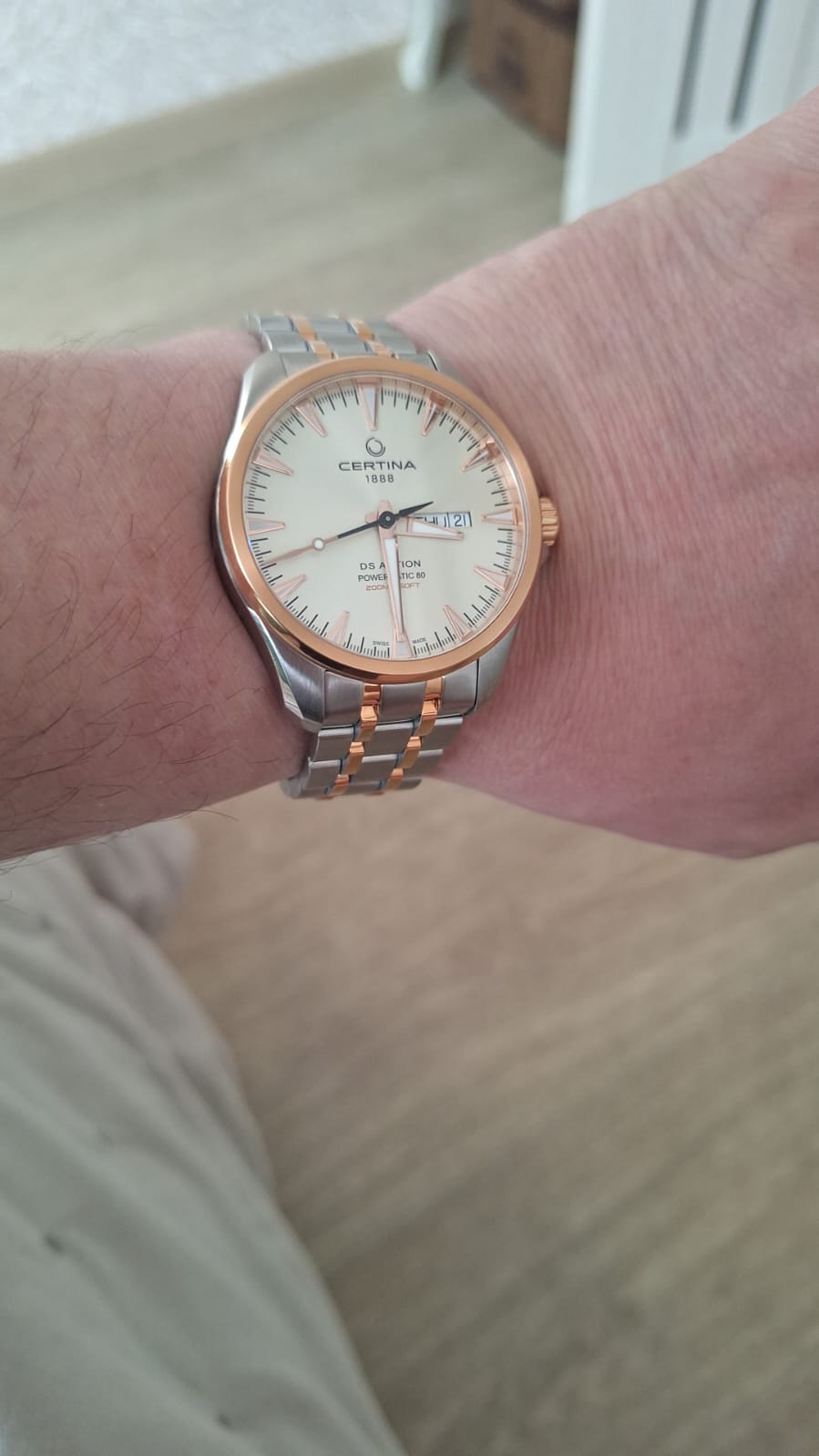 Брендовая модель имеет чёрный циферблат с контрастными стрелками и часовой разметкой, что обеспечивает хорошую читаемость показателей в любых условиях. Стальной браслет надёжно обхватывает запястье, а предотвращает случайное расстёгивание. Часы работают за счёт швейцарского пружинного калибра ETA Powermatic 80Powermatic 80Эксклюзивный калибр от швейцарской компании ETA с увеличенным запасом хода до 80 часов за счёт удлинённой заводной пружины. Характеризуется улучшенной системой спуска со сниженным трением., его запас хода увеличен до 80 часов. Соблюдение DS ConceptDS ConceptDouble Security Concept, обозначает двойную надёжность и безупречную точность часов Certina. Двойная система защиты подразумевает обеспечение максимальной устойчивости к ударам и высоких показателей водонепроницаемости.. Корпус из антикоррозионной стали 316L. PVD-покрытиеPVDУльтратонкое покрытие наносится в технике вакуумного напыления, сочетает в себе нитрид титана особой прочности со слоем золота или оксида хрома. Несёт в себе декоративную или защитную функцию.. Сапфировое стекло с покрытием «антиблик». Водостойкость 200 метров. Подсветка SuperLumiNova®Люминесцентное покрытиеПозволяет считывать показания времени в темноте. Производители наносят на стрелки, часовые индексы, безель или поверхность циферблата светонакопительный состав, дающий холодное свечение.. Закручивающаяся задняя крышка. Защищённая заводная головка. Календарь с индикацией числа и дня недели. Диаметр корпуса: 41 мм.