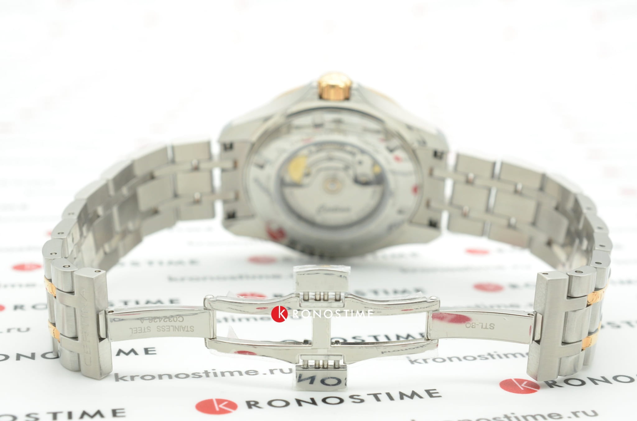 Брендовая модель имеет чёрный циферблат с контрастными стрелками и часовой разметкой, что обеспечивает хорошую читаемость показателей в любых условиях. Стальной браслет надёжно обхватывает запястье, а предотвращает случайное расстёгивание. Часы работают за счёт швейцарского пружинного калибра ETA Powermatic 80Powermatic 80Эксклюзивный калибр от швейцарской компании ETA с увеличенным запасом хода до 80 часов за счёт удлинённой заводной пружины. Характеризуется улучшенной системой спуска со сниженным трением., его запас хода увеличен до 80 часов. Соблюдение DS ConceptDS ConceptDouble Security Concept, обозначает двойную надёжность и безупречную точность часов Certina. Двойная система защиты подразумевает обеспечение максимальной устойчивости к ударам и высоких показателей водонепроницаемости.. Корпус из антикоррозионной стали 316L. PVD-покрытиеPVDУльтратонкое покрытие наносится в технике вакуумного напыления, сочетает в себе нитрид титана особой прочности со слоем золота или оксида хрома. Несёт в себе декоративную или защитную функцию.. Сапфировое стекло с покрытием «антиблик». Водостойкость 200 метров. Подсветка SuperLumiNova®Люминесцентное покрытиеПозволяет считывать показания времени в темноте. Производители наносят на стрелки, часовые индексы, безель или поверхность циферблата светонакопительный состав, дающий холодное свечение.. Закручивающаяся задняя крышка. Защищённая заводная головка. Календарь с индикацией числа и дня недели. Диаметр корпуса: 41 мм.
