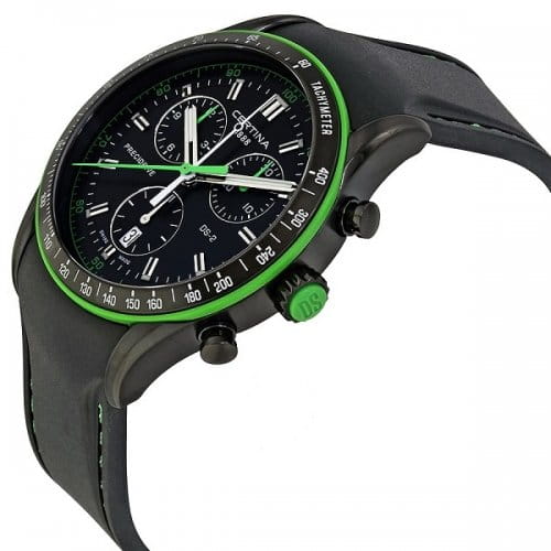 Аксессуар в спортивном стиле оснащён полезными усложнениями: тахиметрТахиметрРазмеченная шкала, располагается на ободке или безеле часов. Тахиметр позволяет рассчитать скорость на определённом участке пути, расстояние измеряется в километрах или милях., секундомер, календарь, хронографХронографФункция позволяет измерять отрезки времени с особой точностью: часы, минуты, секунды. Верным признаком хронографа является наличие на циферблате 3 дополнительных окошек-счётчиков.. За высокую точность хода отвечает швейцарский кварцевый калибр ETA 251.264 Precidrive™Precidrive™Инновационный кварцевый механизм Certina. Часы, оснащённые этим швейцарским калибром, приравниваются к точности к сертифицированным хронометрам, точность хода составляет +/-10 секунд в год.. Часы основаны на концепции Двойной Надёжности DS ConceptDS ConceptDouble Security Concept, обозначает двойную надёжность и безупречную точность часов Certina. Двойная система защиты подразумевает обеспечение максимальной устойчивости к ударам и высоких показателей водонепроницаемости..