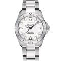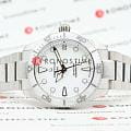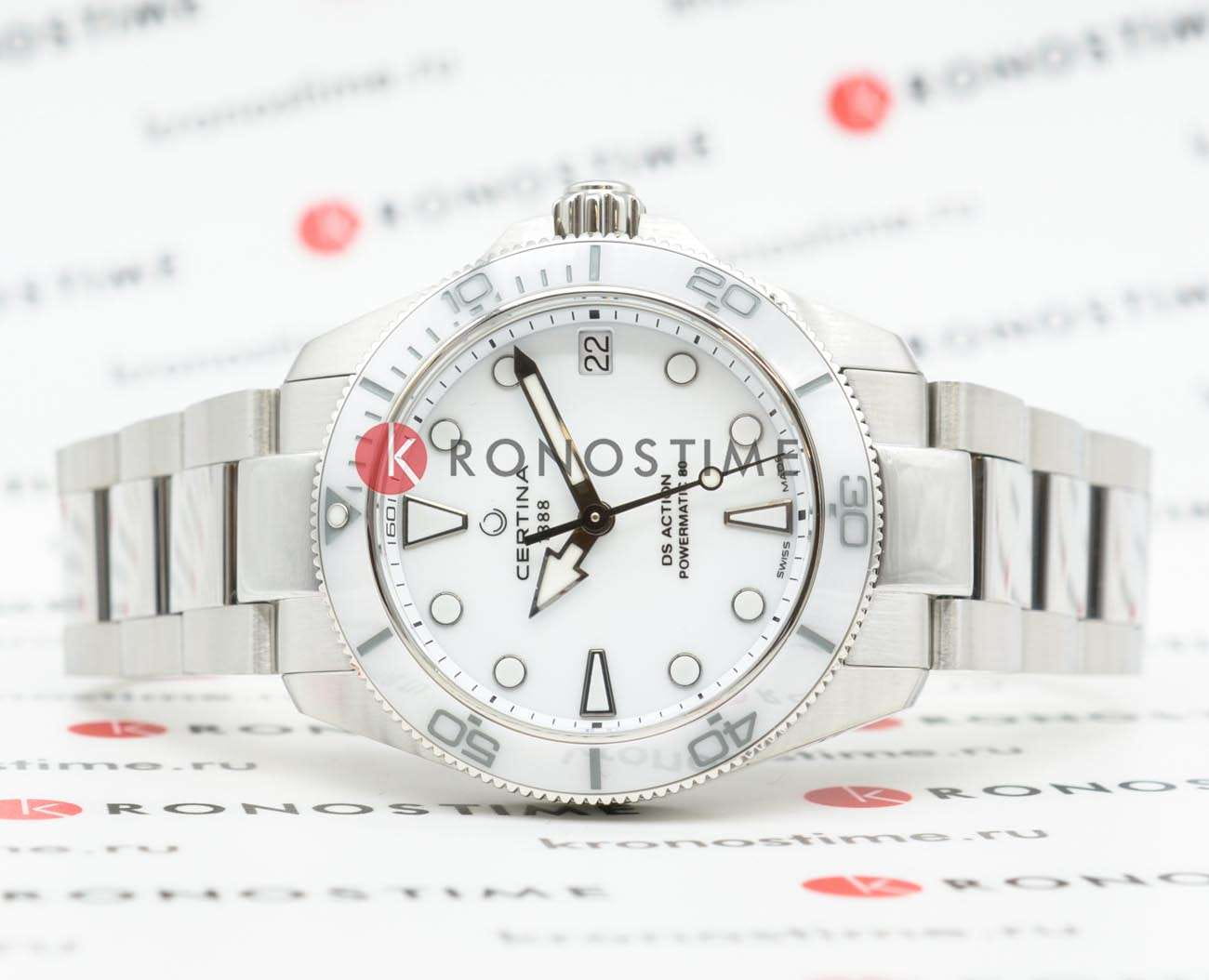 Certina DS Action Lady C032.007.11.011.00 – женские часы для поклонников ярких аксессуаров. И корпус, и браслет изготовлены из высококачественной нержавеющей стали 316L. Под твердым сапфировым стекломСапфировое стеклоПрочный и надёжный материал из кристалла сапфира синтетического происхождения, характеризующийся особой твёрдостью и устойчивостью к царапинам и повреждениям. с антибликовым покрытиемАнтибликовое покрытиеСлой оксида металла в 0,13-0,3 микрон, благодаря которому стекло часов не бликует и не отражает свет. Антибликовое покрытие уменьшает отражение света в 10 раз, обеспечивая отличную читаемость показателей циферблата. находится белый циферблат, на котором вы найдете окошко даты в положении 3 часа и маркировку, покрытую люминесцентным покрытиемЛюминесцентное покрытиеПозволяет считывать показания времени в темноте. Производители наносят на стрелки, часовые индексы, безель или поверхность циферблата светонакопительный состав, дающий холодное свечение. Super-LumiNova. Керамический безельБезельВнешний ободок, закрепляющий стекло. В спортивных часах так называется поворотное кольцо с делениями на циферблате, выполняет роль таймера – замеряет отрезки времени на шкале. Неподвижный безель – элемент декора. Однонаправленно вращающийся безель на дайверских часах позволяет фиксировать моменты погружения и выныривания на поверхность. с минутной шкалой вращается в одном направлении, что позволяет удобно измерять временные отрезки. Все это приводится в действие автоматическим механизмом Powermatic 80Powermatic 80Эксклюзивный калибр от швейцарской компании ETA с увеличенным запасом хода до 80 часов за счёт удлинённой заводной пружины. Характеризуется улучшенной системой спуска со сниженным трением..611 с пружиной Nivachron™Nivachron™Специально разработанный инновационный сплав Nivachron™ повышает устойчивость часов к воздействию магнитных полей.. Класс водозащиты: 300 метров, позволит плавать, нырять и заниматься другими водными видами спорта. Стальной браслет на застёжке-бабочке с кнопкамиЗастёжка "бабочка"Такой вид застёжки дополняется предохранителями, помогающими избежать случайного раскрытия браслета. Обладают изящным исполнением. .