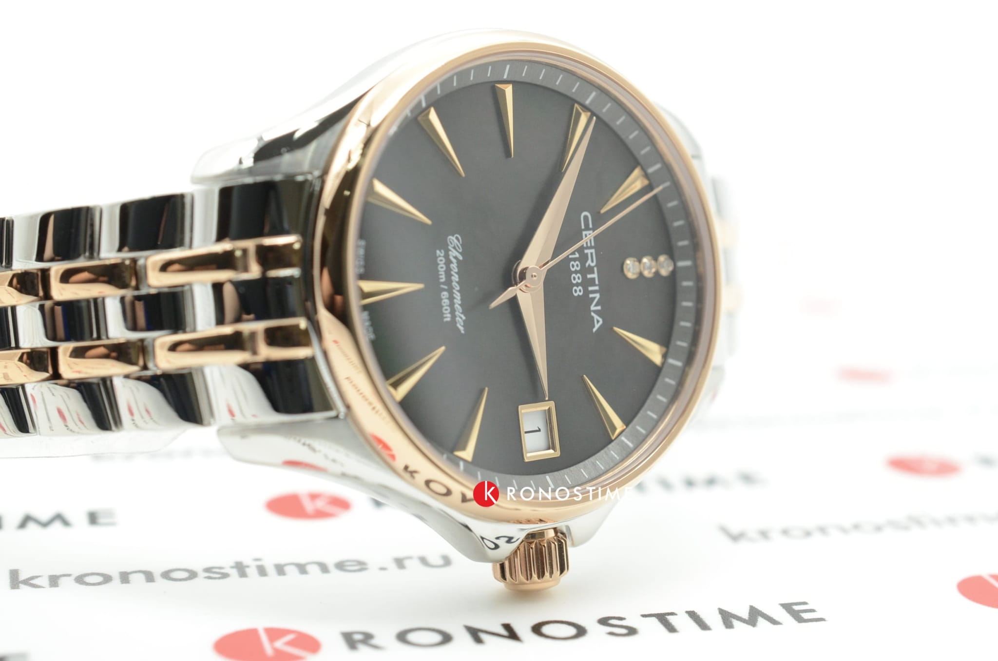 Аксессуар обладает изящным силуэтом, отражающим классический стиль и элегантность. Циферблат украшен 3 роскошными бриллиантами оттенка Top Wesselton. Часы комплектуются высокоточным кварцевым калибром F06.411 от швейцарской компании ETA, высокая точность механизма подтверждается сертификатом хронометра COSCСертификат COSCОфициальный сертификат, подтверждающий то, что часы ходят с особо высокой точностью. Для получения документа часы подвергаются тестовым испытаниям, разработанным швейцарским институтом тестирования хронометров COSC. Допустимая норма для механических часов -4/+6 секунд в день, для кварцевых моделей +/- 0,07 секунд в день.. Концепция DS ConceptDS ConceptDouble Security Concept, обозначает двойную надёжность и безупречную точность часов Certina. Двойная система защиты подразумевает обеспечение максимальной устойчивости к ударам и высоких показателей водонепроницаемости. гарантирует повышенную ударопрочность часов и сохранение водонепроницаемости до 20 бар. Одностороннее антибликовое покрытие сапфирового стекла.Корпус и браслет из хирургической стали 316L. PVD-покрытиеPVDУльтратонкое покрытие наносится в технике вакуумного напыления, сочетает в себе нитрид титана особой прочности со слоем золота или оксида хрома. Несёт в себе декоративную или защитную функцию. цвета розового золота. . Окошко даты, функция EOLEOLПредставляет собой систему, уведомляющую владельца часов о необходимости замены элемента питания. За 2 недели до полного разряда батарейки секундная стрелка перестаёт ходить чётко и начинает перепрыгивать на 3-4 деления.. Диаметр корпуса: 33,8 мм.