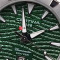 Компактный циферблат дополнен необычным узором в виде волн с блестящими акцентами, что стало выражением любви бренда Certina к морской стихии. Изящный аксессуар внутри просто «кремень», чему способствует система DS ConceptDS ConceptDouble Security Concept, обозначает двойную надёжность и безупречную точность часов Certina. Двойная система защиты подразумевает обеспечение максимальной устойчивости к ударам и высоких показателей водонепроницаемости.: водонепроницаемость 300 метров, завинчивающаяся задняя крышка и заводная головка с системой блокировки, сапфировое стекло, хирургическая сталь 316L. Швейцарский кварцевый механизм ETA F04.411 Precidrive™Precidrive™Инновационный кварцевый механизм Certina. Часы, оснащённые этим швейцарским калибром, приравниваются к точности к сертифицированным хронометрам, точность хода составляет +/-10 секунд в год. отмечен сертификатом хронометра COSCСертификат COSCОфициальный сертификат, подтверждающий то, что часы ходят с особо высокой точностью. Для получения документа часы подвергаются тестовым испытаниям, разработанным швейцарским институтом тестирования хронометров COSC. Допустимая норма для механических часов -4/+6 секунд в день, для кварцевых моделей +/- 0,07 секунд в день. за безупречную точность хода. Вращающийся безельБезельВнешний ободок, закрепляющий стекло. В спортивных часах так называется поворотное кольцо с делениями на циферблате, выполняет роль таймера – замеряет отрезки времени на шкале. Неподвижный безель – элемент декора. Однонаправленно вращающийся безель на дайверских часах позволяет фиксировать моменты погружения и выныривания на поверхность.. Яркая люминесцентная подсветкаЛюминесцентное покрытиеПозволяет считывать показания времени в темноте. Производители наносят на стрелки, часовые индексы, безель или поверхность циферблата светонакопительный состав, дающий холодное свечение.. Апертура даты, функция EOLEOLПредставляет собой систему, уведомляющую владельца часов о необходимости замены элемента питания. За 2 недели до полного разряда батарейки секундная стрелка перестаёт ходить чётко и начинает перепрыгивать на 3-4 деления.. Диаметр корпуса: 34 мм.