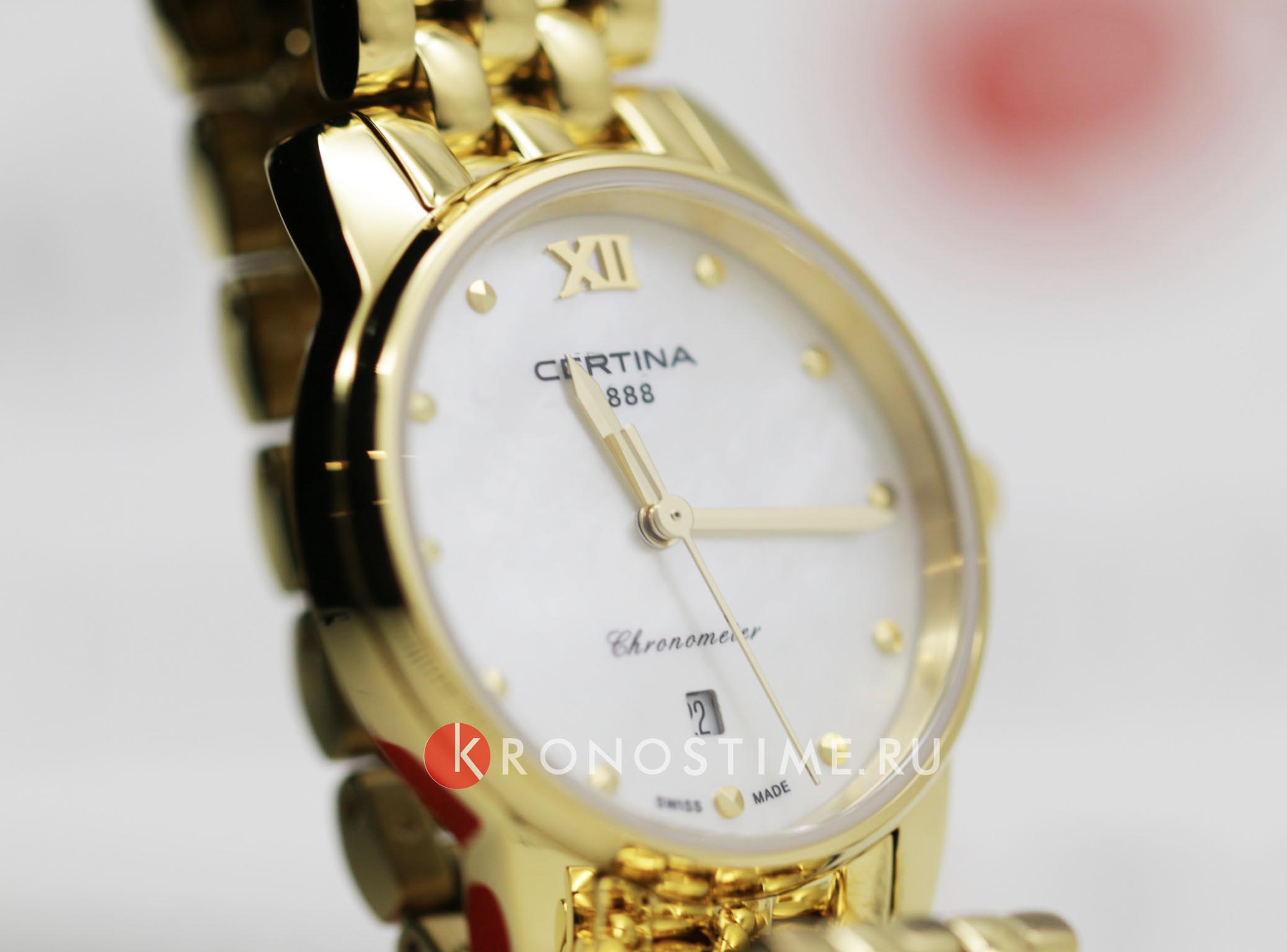 Изысканный аксессуар – лучший вариант для делового костюма или вечернего наряда. Эффектный перламутровый циферблат, бело-серого цвета дополнен незатейливым узором и золотистой часовой разметкой. Часы привлекают не только дизайном, но и абсолютной точностью: швейцарский кварцевый механизм ETA F03.412 Precidrive™Precidrive™Инновационный кварцевый механизм Certina. Часы, оснащённые этим швейцарским калибром, приравниваются к точности к сертифицированным хронометрам, точность хода составляет +/-10 секунд в год. удостоился официального сертификата COSCСертификат COSCОфициальный сертификат, подтверждающий то, что часы ходят с особо высокой точностью. Для получения документа часы подвергаются тестовым испытаниям, разработанным швейцарским институтом тестирования хронометров COSC. Допустимая норма для механических часов -4/+6 секунд в день, для кварцевых моделей +/- 0,07 секунд в день.. Система DS ConceptDS ConceptDouble Security Concept, обозначает двойную надёжность и безупречную точность часов Certina. Двойная система защиты подразумевает обеспечение максимальной устойчивости к ударам и высоких показателей водонепроницаемости.. Противокоррозионная сталь 316L с PVD-покрытиемPVDУльтратонкое покрытие наносится в технике вакуумного напыления, сочетает в себе нитрид титана особой прочности со слоем золота или оксида хрома. Несёт в себе декоративную или защитную функцию.. Степень водозащиты WR 100 позволит плавать, нырять и заниматься другими водными видами спорта. Сапфировое стеклоСапфировое стеклоПрочный и надёжный материал из кристалла сапфира синтетического происхождения, характеризующийся особой твёрдостью и устойчивостью к царапинам и повреждениям. с антибликовой обработкой. Застёжка «бабочка» с кнопкамиЗастёжка "бабочка"Такой вид застёжки дополняется предохранителями, помогающими избежать случайного раскрытия браслета. Обладают изящным исполнением. . Отображение числа, индикатор EOLEOLПредставляет собой систему, уведомляющую владельца часов о необходимости замены элемента питания. За 2 недели до полного разряда батарейки секундная стрелка перестаёт ходить чётко и начинает перепрыгивать на 3-4 деления.. Диаметр корпуса: 27,5 мм.