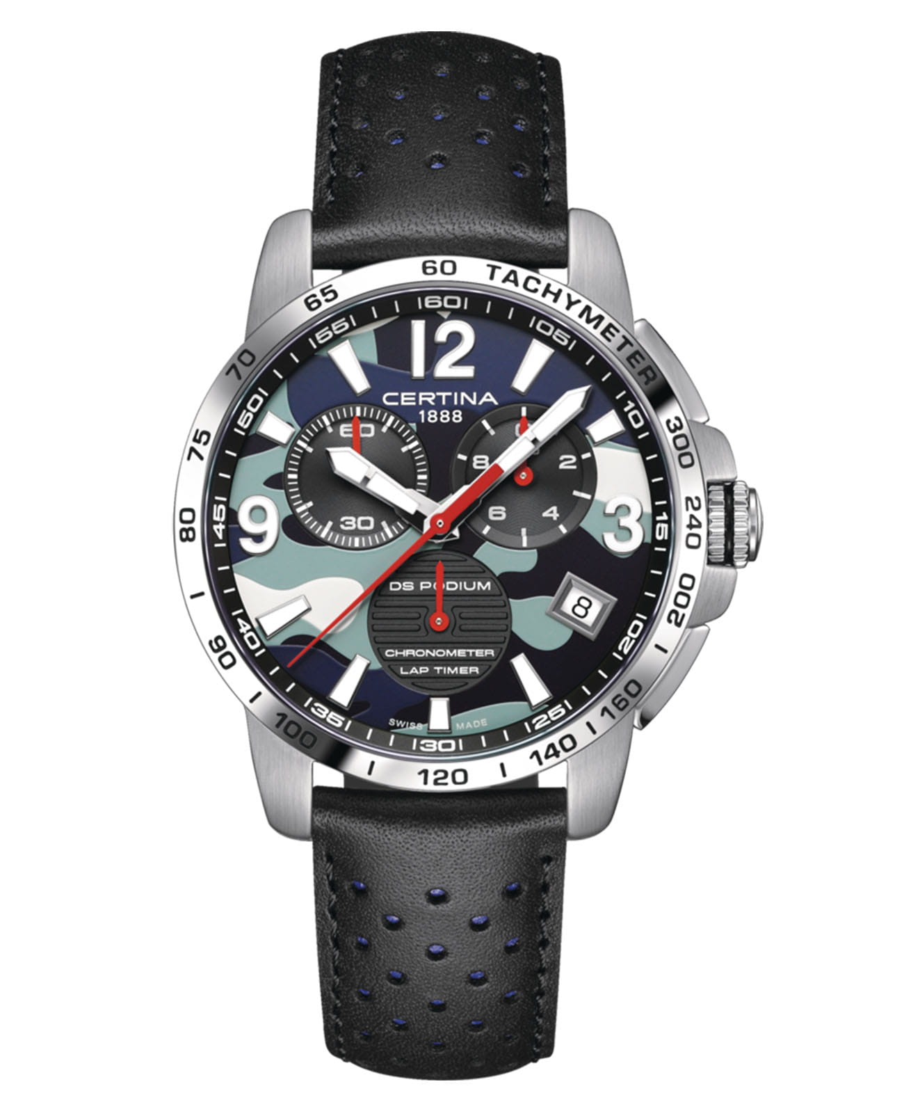 Наручные часы в спортивном стиле привлекают внимание красными деталями, что символизирует скоростное напряжение на гоночной трассе. Отличным дополнением стал кожаный ремешок с перфорацией из натурального материала. Кварцевый швейцарский механизм ETA G10.212 Precidrive™Precidrive™Инновационный кварцевый механизм Certina. Часы, оснащённые этим швейцарским калибром, приравниваются к точности к сертифицированным хронометрам, точность хода составляет +/-10 секунд в год. с повышенной точностью хода, подтверждённой сертификатом COSCСертификат COSCОфициальный сертификат, подтверждающий то, что часы ходят с особо высокой точностью. Для получения документа часы подвергаются тестовым испытаниям, разработанным швейцарским институтом тестирования хронометров COSC. Допустимая норма для механических часов -4/+6 секунд в день, для кварцевых моделей +/- 0,07 секунд в день.. Система DS ConceptDS ConceptDouble Security Concept, обозначает двойную надёжность и безупречную точность часов Certina. Двойная система защиты подразумевает обеспечение максимальной устойчивости к ударам и высоких показателей водонепроницаемости.. Двухстороннее антибликовое покрытие для стекла из сапфира. Стрелки и индексы с составом SuperLumiNovaЛюминесцентное покрытиеПозволяет считывать показания времени в темноте. Производители наносят на стрелки, часовые индексы, безель или поверхность циферблата светонакопительный состав, дающий холодное свечение.. Заводная головка с защитой. ХронографХронографФункция позволяет измерять отрезки времени с особой точностью: часы, минуты, секунды. Верным признаком хронографа является наличие на циферблате 3 дополнительных окошек-счётчиков., шкала тахиметраТахиметрРазмеченная шкала, располагается на ободке или безеле часов. Тахиметр позволяет рассчитать скорость на определённом участке пути, расстояние измеряется в километрах или милях., календарь, секундомер, индикатор EOLEOLПредставляет собой систему, уведомляющую владельца часов о необходимости замены элемента питания. За 2 недели до полного разряда батарейки секундная стрелка перестаёт ходить чётко и начинает перепрыгивать на 3-4 деления., Lap-функция измерения промежуточного времени (круга). Диаметр корпуса: 42 мм.