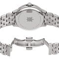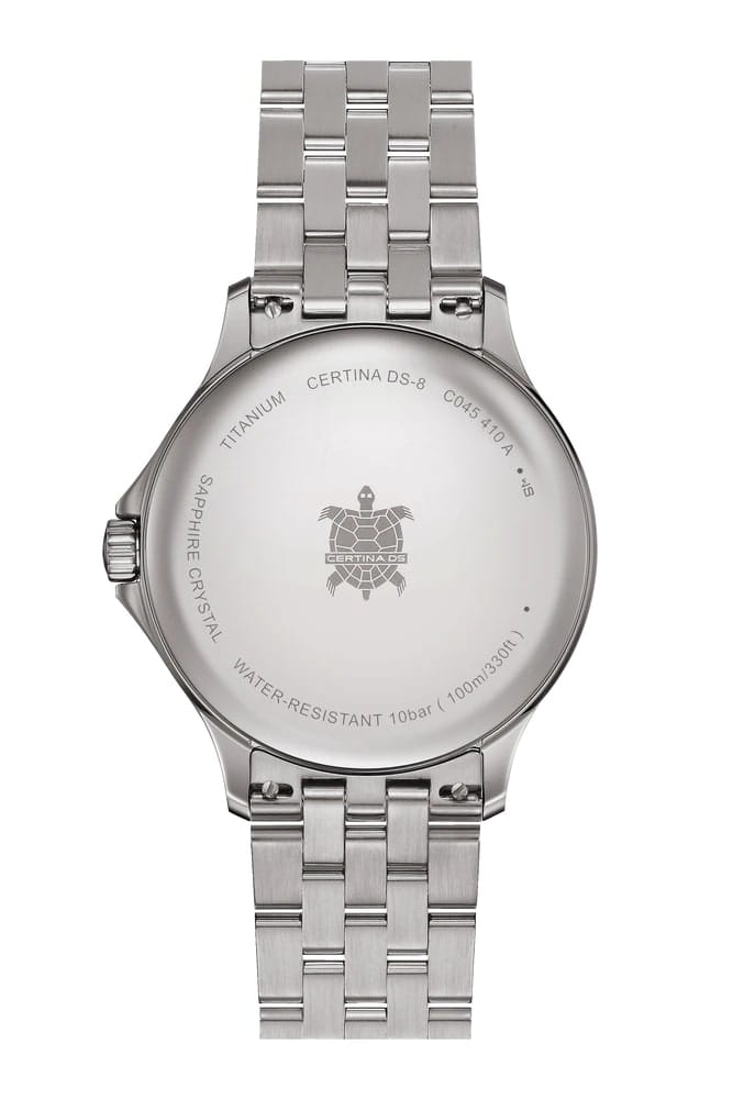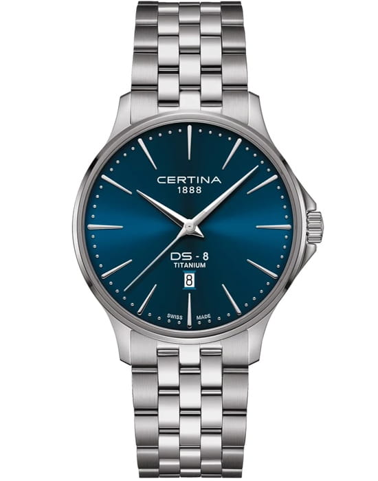 Швейцарские кварцевые мужские часы Certina DS-8 Gent C045.410.44.041.00 — это воплощение элегантности, прочности и точности. Модель выполнена из титана — лёгкого и гипоаллергенного материала, устойчивого к коррозии и повреждениям, что делает часы комфортными в носке и долговечными. Часы оснащены механизмом калибра ETA F05.412, обеспечивающим высокую точность хода, а также функцией индикатора разряда батареиEOLПредставляет собой систему, уведомляющую владельца часов о необходимости замены элемента питания. За 2 недели до полного разряда батарейки секундная стрелка перестаёт ходить чётко и начинает перепрыгивать на 3-4 деления., которая своевременно предупредит о необходимости замены элемента питания. На циферблате синего цвета чётко выделяются белые стрелки и метки, что гарантирует отличную читаемость. Окошко даты размещено в положении 3 часов, дополняя функциональность модели. Защиту циферблата обеспечивает сапфировое стеклоСапфировое стеклоПрочный и надёжный материал из кристалла сапфира синтетического происхождения, характеризующийся особой твёрдостью и устойчивостью к царапинам и повреждениям. с антибликовым покрытиемАнтибликовое покрытиеСлой оксида металла в 0,13-0,3 микрон, благодаря которому стекло часов не бликует и не отражает свет. Антибликовое покрытие уменьшает отражение света в 10 раз, обеспечивая отличную читаемость показателей циферблата., устойчивое к царапинам и обеспечивающее комфортное считывание информации при любом освещении. Завинчивающаяся заводная головка защищаетУдаропрочный корпусМеханизм заключён в корпус, выполненный из современных материалов, устойчивых к ударам, механическим повреждениям и падению с высоты: инновационный пластик, карбон, нержавеющая сталь, титан. механизм от случайных повреждений и пыли. Часы обладают водонепроницаемостью , что позволяет использовать их при плавании и других водных активностях. Толщина корпуса составляет 10,35 мм, а его диаметр — 40 мм, что делает модель идеально сбалансированной на запястье. Браслет из титана дополнен застёжкой-бабочкой с кнопкамиЗастёжка "бабочка"Такой вид застёжки дополняется предохранителями, помогающими избежать случайного раскрытия браслета. Обладают изящным исполнением. , обеспечивающей комфорт и уверенную фиксацию на руке. Такое сочетание материалов и дизайна подчёркивает строгий и современный стиль модели. Эти часы станут универсальным аксессуаром для тех, кто ценит точность, качество и лаконичный дизайн — идеальный выбор для уверенных в себе мужчин, следящих за своим образом и статусом.