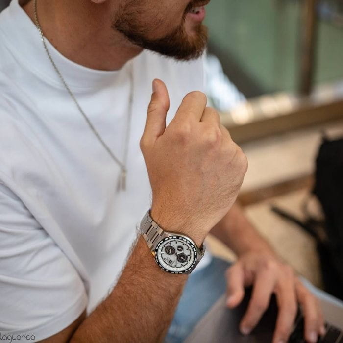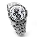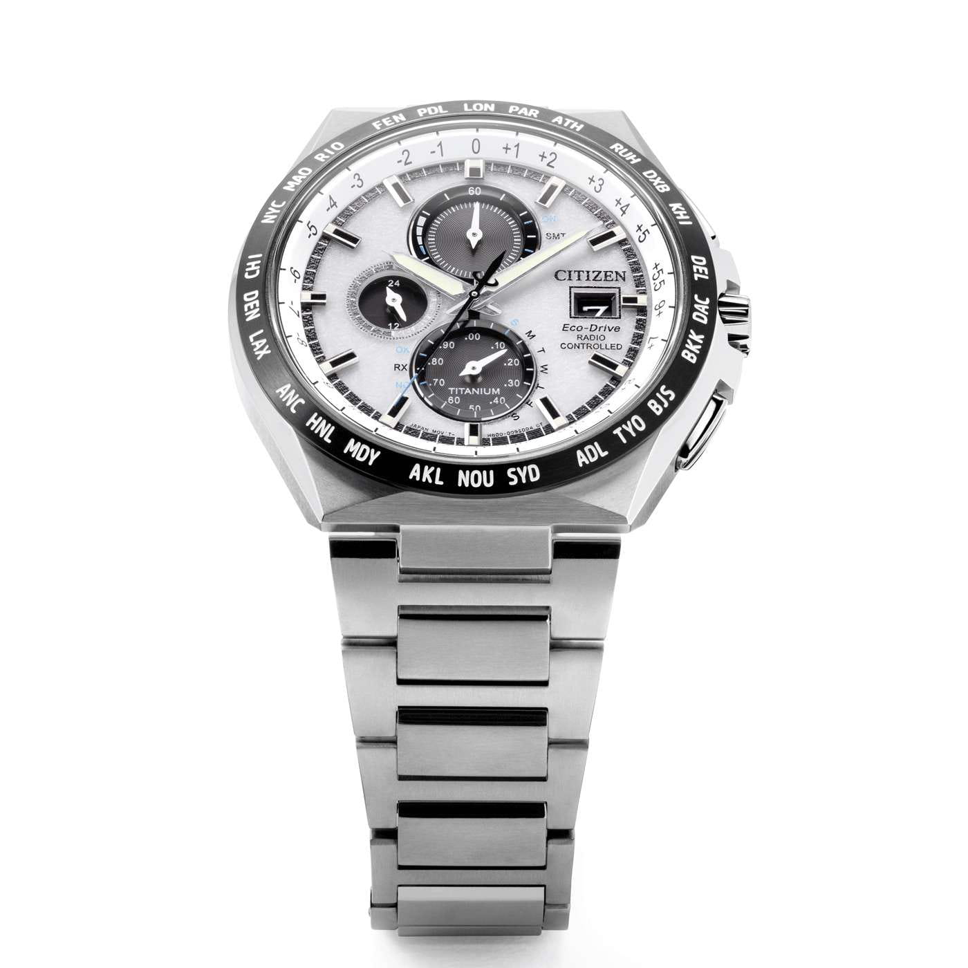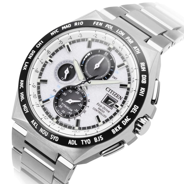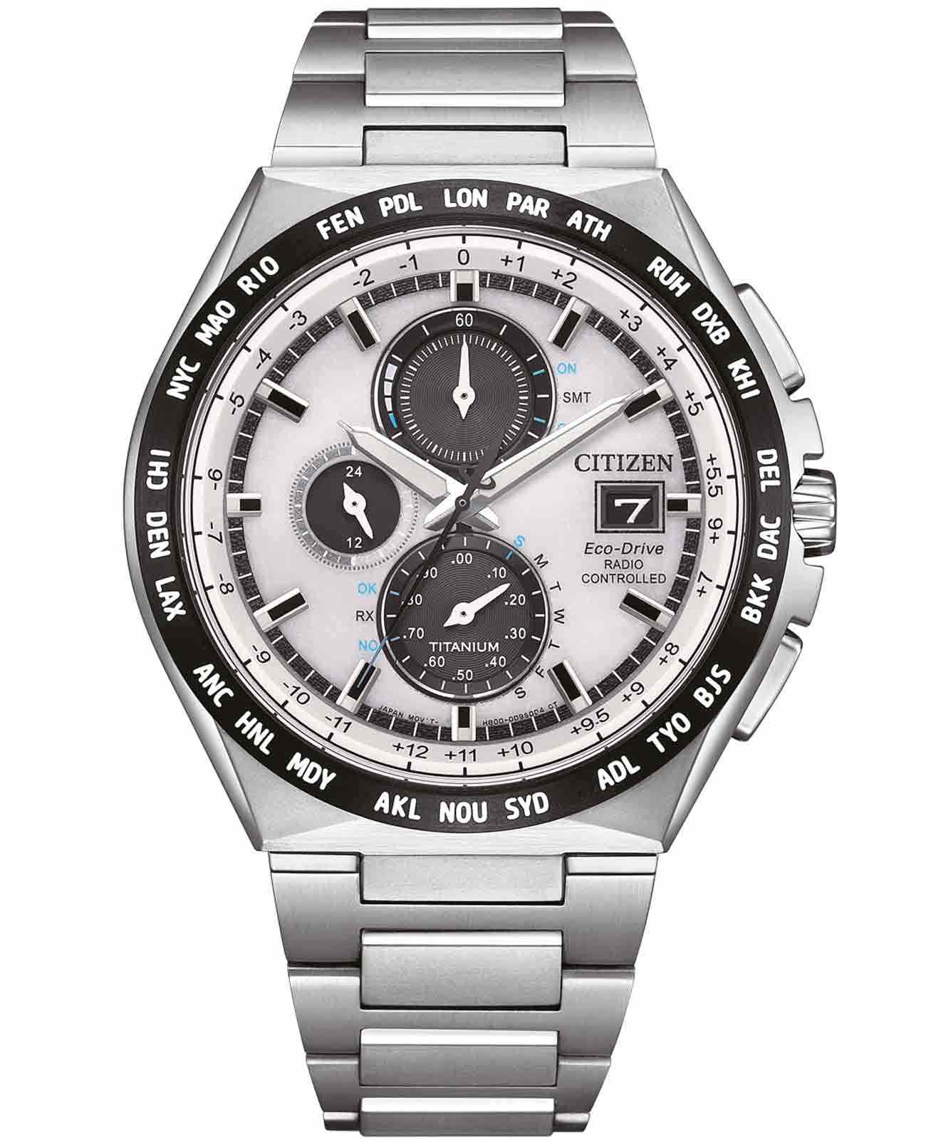 Японские наручные часы Citizen AT8238-84A сочетают в себе передовые технологии, надежность и стильный современный дизайн. Корпус и браслет выполнены из высокопрочного материала Super Titanium, который в пять раз тверже и на 40% легче стали, а также отличается высокой устойчивостью к царапинам и коррозии, а на безельБезельВнешний ободок, закрепляющий стекло. В спортивных часах так называется поворотное кольцо с делениями на циферблате, выполняет роль таймера – замеряет отрезки времени на шкале. Неподвижный безель – элемент декора. Однонаправленно вращающийся безель на дайверских часах позволяет фиксировать моменты погружения и выныривания на поверхность. нанесено черное IP-покрытиеIP-покрытиеМетод ионного напыления. Демонстрирует повышенную устойчивость к истиранию, окислению и химическим веществам. Под воздействием высокого давления и температуры около 1500°C молекулы металла надёжно соединяются с частицами корпуса часов.. Диаметр корпуса составляет 43,5 мм, толщина — 10 мм, а вес — всего 90 грамм, что обеспечивает легкость и комфорт при ежедневном ношении. Часы оснащены кварцевым хронографомХронографФункция позволяет измерять отрезки времени с особой точностью: часы, минуты, секунды. Верным признаком хронографа является наличие на циферблате 3 дополнительных окошек-счётчиков. на солнечной батарее с системой Eco-Drive, не требующей замены батарейки, и калибром Citizen H800, обеспечивающим до 6 месяцев работы без подзарядки и защиту от перезаряда. Особенностью модели является автоматическая синхронизация времени по радиосигналу в четырех регионах мира, охватывающая 26 часовых зон, а также функция мирового времениМировое время Полезное часовое усложнение, отображающее время в основных городах и известных областях по всему миру, оно связано с часовыми поясами, удобно для путешественников и бизнесменов. и вечного календаряВечный календарьКлассическое часовое усложнение, представляющее собой календарь, рассчитанный на несколько лет вперёд (стандартно – до 2099 года). Определяет текущую дату, день недели, месяц., рассчитанного до 2100 года. На белом циферблате расположены центральные часовая и минутная стрелки с люминесцентным покрытиемЛюминесцентное покрытиеПозволяет считывать показания времени в темноте. Производители наносят на стрелки, часовые индексы, безель или поверхность циферблата светонакопительный состав, дающий холодное свечение. для отличной читаемости в темноте, а также апертура даты в позиции 3 часов и отдельный малый циферблат для секундной стрелки. Часы поддерживают 12/24-часовой формат времени, оснащены секундомеромСекундомерСекундоме́р — прибор, способный измерять интервалы времени с точностью до долей секунды. с точностью 1/20 секунды и максимальным временем измерения 60 минут, а также индикатором окончания ресурса элемента питания EOLEOLПредставляет собой систему, уведомляющую владельца часов о необходимости замены элемента питания. За 2 недели до полного разряда батарейки секундная стрелка перестаёт ходить чётко и начинает перепрыгивать на 3-4 деления.. Устойчивое к царапинам сапфировое стеклоСапфировое стеклоПрочный и надёжный материал из кристалла сапфира синтетического происхождения, характеризующийся особой твёрдостью и устойчивостью к царапинам и повреждениям. с антибликовым покрытиемАнтибликовое покрытиеС