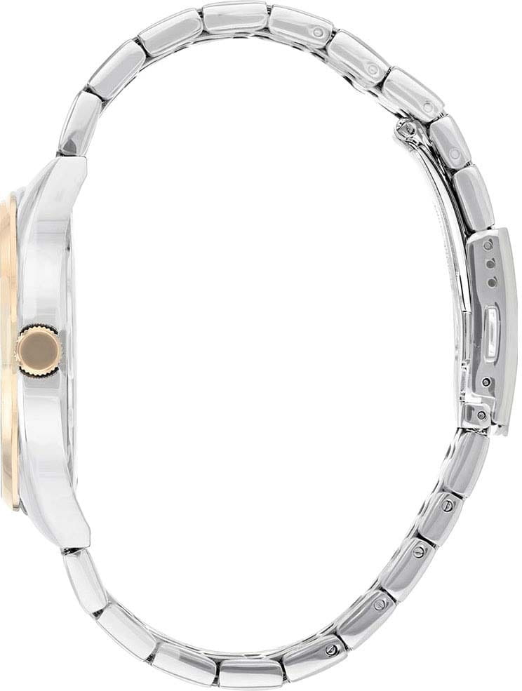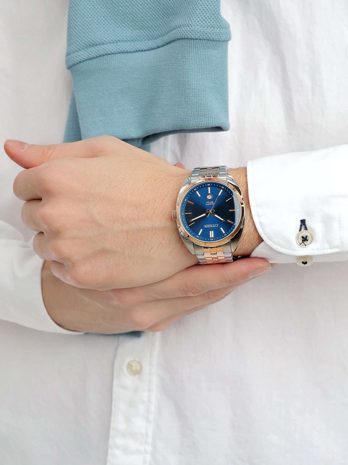 Часы Citizen BI5096-53L — это стильная и надежная модель японского производства, оснащённая высокоточным кварцевым механизмом Citizen G111. Круглый корпус диаметром 42 мм выполнен из нержавеющей стали, что придаёт изделию элегантный и современный вид, а также защищает от внешних воздействий. БезельБезельВнешний ободок, закрепляющий стекло. В спортивных часах так называется поворотное кольцо с делениями на циферблате, выполняет роль таймера – замеряет отрезки времени на шкале. Неподвижный безель – элемент декора. Однонаправленно вращающийся безель на дайверских часах позволяет фиксировать моменты погружения и выныривания на поверхность. с элегантным золотистым IP-покрытиемIP-покрытиеМетод ионного напыления. Демонстрирует повышенную устойчивость к истиранию, окислению и химическим веществам. Под воздействием высокого давления и температуры около 1500°C молекулы металла надёжно соединяются с частицами корпуса часов.. Синий циферблат оформлен минималистично, с метками в виде аккуратных штрихов и заострёнными прямоугольными стрелками в стиле Baton с люминесцентным покрытиемЛюминесцентное покрытиеПозволяет считывать показания времени в темноте. Производители наносят на стрелки, часовые индексы, безель или поверхность циферблата светонакопительный состав, дающий холодное свечение. для удобного считывания времени даже в темноте. Минеральное стеклоМинеральное стеклоМинеральное стекло представляет собой искусственно выращенный минерал кварца. Такое стекло отличается особой устойчивостью к повреждениям и царапинам. Уступает по некоторым качествам сапфировому стеклу. гарантирует защиту от царапин и сохраняет презентабельный внешний вид на долгое время. Окошко календаря с отображением числа расположено в позиции 6 часов, что добавляет функциональности и подчеркивает современный стиль модели. Рифленая заводная головка обеспечивает лёгкость настройки, а стальной браслет с частичным золотистым IP-покрытиемIP-покрытиеМетод ионного напыления. Демонстрирует повышенную устойчивость к истиранию, окислению и химическим веществам. Под воздействием высокого давления и температуры около 1500°C молекулы металла надёжно соединяются с частицами корпуса часов. и раскладывающейся застёжкой надёжно фиксирует часы на запястье. Водозащита до 50 метров позволяет не опасаться случайного контакта с водой в повседневной жизни.