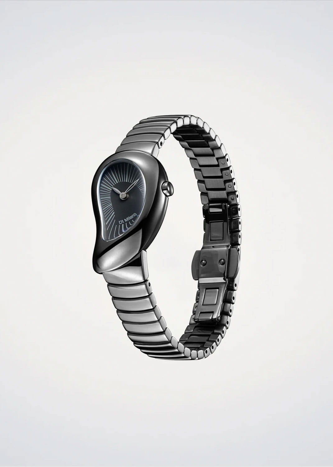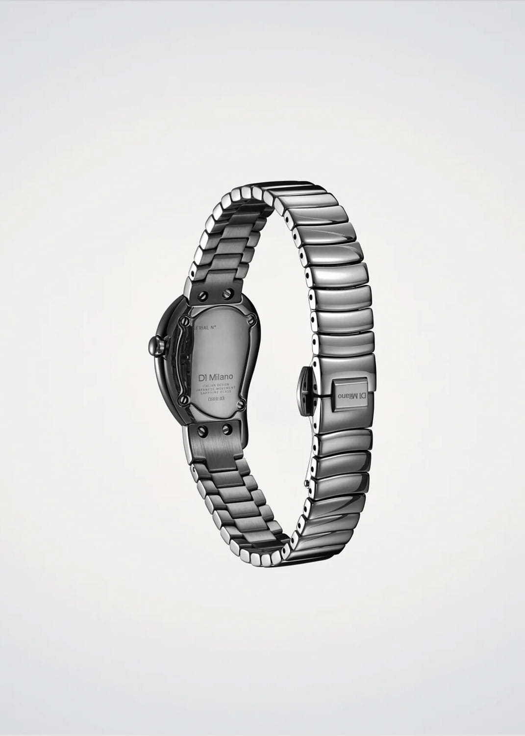 Женские кварцевые часы D1 Milano Drop DRBL03 — это стильное сочетание элегантности и современного дизайна. Стальной корпус в форме капли выполнен из нержавеющей стали с PVD-покрытиемPVDУльтратонкое покрытие наносится в технике вакуумного напыления, сочетает в себе нитрид титана особой прочности со слоем золота или оксида хрома. Несёт в себе декоративную или защитную функцию. серого цвета, диаметром 23 мм, что придаст образу элегантности и надежности. Изысканный циферблат с метками в виде штрихов придает модели особый блеск. Циферблат защищен сапфировым стекломСапфировое стеклоПрочный и надёжный материал из кристалла сапфира синтетического происхождения, характеризующийся особой твёрдостью и устойчивостью к царапинам и повреждениям. с антибликовым покрытиемАнтибликовое покрытиеСлой оксида металла в 0,13-0,3 микрон, благодаря которому стекло часов не бликует и не отражает свет. Антибликовое покрытие уменьшает отражение света в 10 раз, обеспечивая отличную читаемость показателей циферблата., обеспечивающий устойчивость к царапинам. Часы оснащены надежным кварцевым механизмом. Стальной браслет с PVD-покрытиемPVDУльтратонкое покрытие наносится в технике вакуумного напыления, сочетает в себе нитрид титана особой прочности со слоем золота или оксида хрома. Несёт в себе декоративную или защитную функцию. на застёжке-бабочке с кнопкамиЗастёжка "бабочка"Такой вид застёжки дополняется предохранителями, помогающими избежать случайного раскрытия браслета. Обладают изящным исполнением. , гарантирует комфортное и безопасное ношение. Класс водозащиты: 50 метров позволит защитить корпус от случайных брызг или капель дождя. Отличный выбор для тех, кто ценит утонченность и качество.