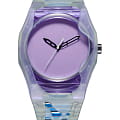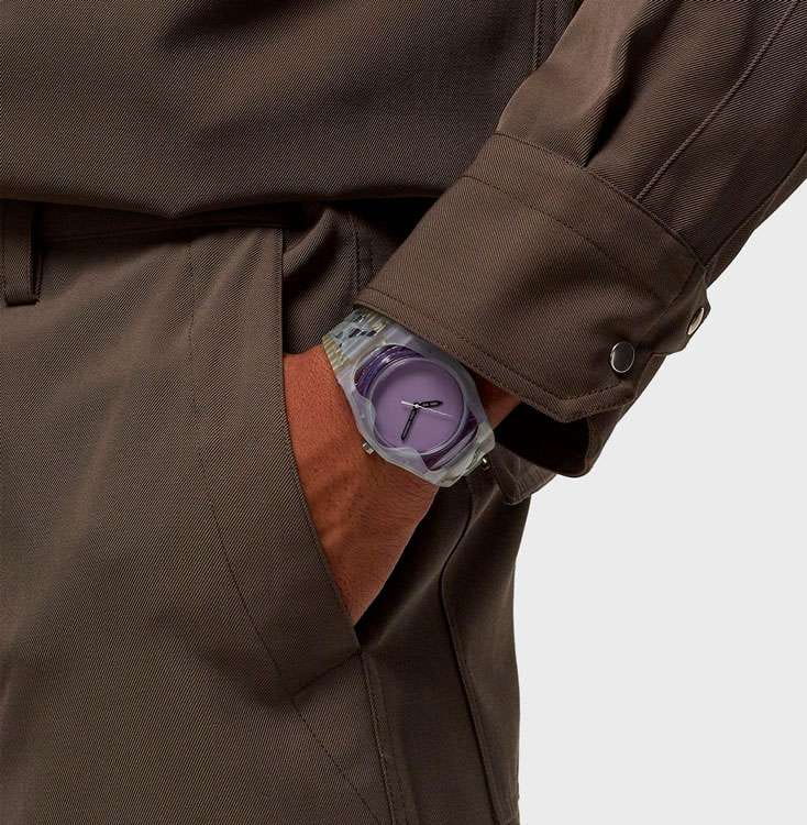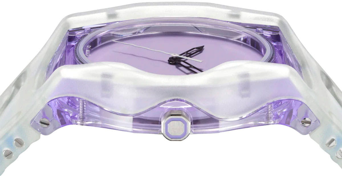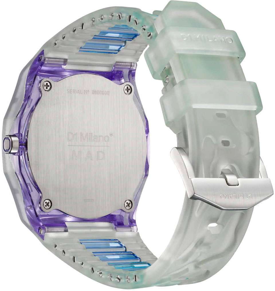 Мужские часы D1 Milano MAD Paris x D1 MDRJ03 - уникальный аксессуар. Milano и MAD Paris представили ограниченную серию часов из шести необычных моделей, характеризующуюся яркой цветовой гаммой и монохромной эстетикой. Часы Freezer имеют корпус из прозрачного нейлона, покрытого матовым полупрозрачным полиуретаном. Матовый циферблат без меток и стрелки в стиле Skeleton. Циферблат защищен минеральным стекломМинеральное стеклоМинеральное стекло представляет собой искусственно выращенный минерал кварца. Такое стекло отличается особой устойчивостью к повреждениям и царапинам. Уступает по некоторым качествам сапфировому стеклу., устойчивым к царапинам. Секундная стрелка имеет оригинальную волнообразную форму. Задняя крышка стальная, крепится на 4 винтах, каждый экземпляр имеет индивидуальный серийный номер. Ремешок оснащен классической застежкой.