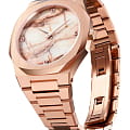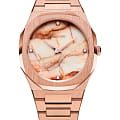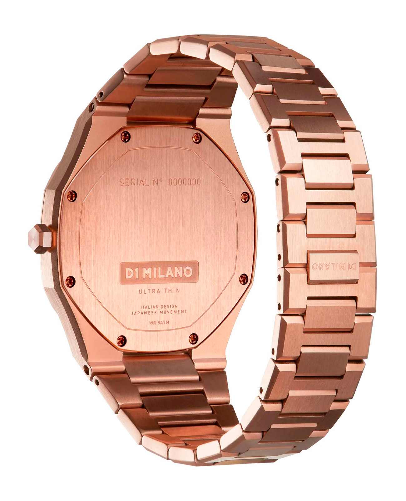 Женские наручные часы D1 Milano UTBL14 из коллекции Ultra Thin сочетают в себе элегантный дизайн и современные технологии. Модель обладает круглым корпусом диаметром 34 мм, изготовленным из высококачественной нержавеющей стали с PVD-покрытиемPVDУльтратонкое покрытие наносится в технике вакуумного напыления, сочетает в себе нитрид титана особой прочности со слоем золота или оксида хрома. Несёт в себе декоративную или защитную функцию. в розовое золото, что обеспечивает устойчивость к внешним воздействиям. Толщина ультратонкого корпуса составляет всего 6 мм, делая аксессуар легким и удобным для повседневного использования. Браслет также выполнен из нержавеющей стали с раскладной застежкойРаскладной замокДанный вариант застежки используется только на часах с металлическим браслетом. Отличительная особенность такого крепления в том, что длина браслета становится универсальной и вы можете самостоятельно отрегулировать нужный вам размер – застежка просто двигается по браслету часов., гарантирующей комфортное ношение и безопасность. Циферблат бело-розового мраморного цвета украшен метками в виде кристаллов и оснащен стрелочным механизмом в тон корпуса, который подчеркивает элегантность модели. Для защиты используется сапфировое стеклоСапфировое стеклоПрочный и надёжный материал из кристалла сапфира синтетического происхождения, характеризующийся особой твёрдостью и устойчивостью к царапинам и повреждениям., обеспечивающее прочную защиту от царапин и бликов. Часы работают на кварцевом механизме, гарантирующем точность хода без необходимости регулярного подзавода. Водонепроницаемость часов достигает 5 атмосфер (50 метров), что позволяет использовать их во время мытья рук или плавания, однако не рекомендуется для глубоководного дайвинга.
