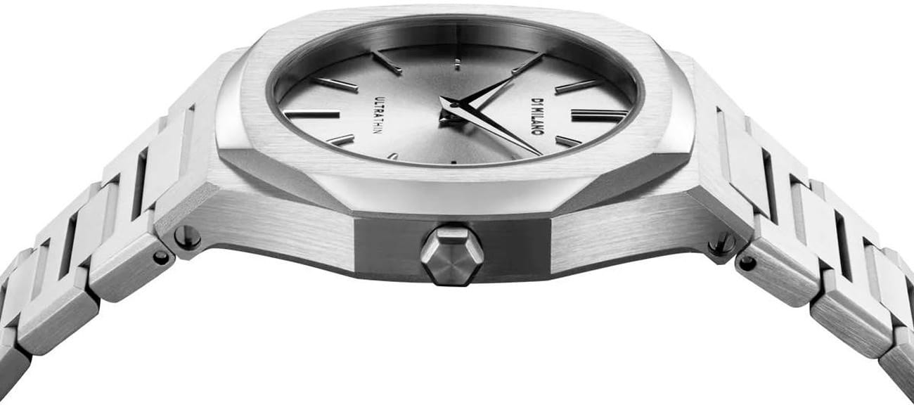 Наручные часы D1 Milano UTBL30 из коллекции Ultra Thin сочетают в себе элегантный дизайн и современные технологии. Модель обладает круглым корпусом диаметром 30 мм, изготовленным из нержавеющей стали с вертикальной шлифовкой, что обеспечивает высокую устойчивость к внешним воздействиям. Для защиты циферблата используется сапфировое стеклоСапфировое стеклоПрочный и надёжный материал из кристалла сапфира синтетического происхождения, характеризующийся особой твёрдостью и устойчивостью к царапинам и повреждениям. с антибликовым покрытиемАнтибликовое покрытиеСлой оксида металла в 0,13-0,3 микрон, благодаря которому стекло часов не бликует и не отражает свет. Антибликовое покрытие уменьшает отражение света в 10 раз, обеспечивая отличную читаемость показателей циферблата., которое эффективно противостоит царапинам и механическим повреждениям. Часы оснащены кварцевым механизмом Miyota 1L22, гарантирующим точное время без необходимости подзаводки. Водонепроницаемость модели достигает 5 атмосфер (50 метров), что позволяет использовать их при контакте с водой, например, во время мытья рук или дождя. Браслет выполнен из нержавеющей стали с раскладной застежкой с кнопкойРаскладной замокДанный вариант застежки используется только на часах с металлическим браслетом. Отличительная особенность такого крепления в том, что длина браслета становится универсальной и вы можете самостоятельно отрегулировать нужный вам размер – застежка просто двигается по браслету часов., обеспечивающей комфортное ношение и безопасность. Циферблат серебристого цвета с узором Sunray (Soleil) придает часам особую изысканность и делает их идеальным выбором для повседневного использования или особых случаев.