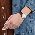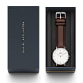 Женские наручные часы с минеральным стекломМинеральное стеклоМинеральное стекло представляет собой искусственно выращенный минерал кварца. Такое стекло отличается особой устойчивостью к повреждениям и царапинам. Уступает по некоторым качествам сапфировому стеклу. Daniel Wellington DW00100056, кварцевый механизм с высокой точностью. Класс водозащиты: 30 метров, позволит защитить корпус от случайных брызг или капель дождя. Корпус часов изготовлен из стали с PVD-покрытиемPVDУльтратонкое покрытие наносится в технике вакуумного напыления, сочетает в себе нитрид титана особой прочности со слоем золота или оксида хрома. Несёт в себе декоративную или защитную функцию.. Кожаный ремешок на стандартной застёжке. Матовый циферблат украшен фирменным логотипом Daniel Wellington. Накладные метки в виде штрихов. Японский кварцевый механизм. Рифленая заводная головка.