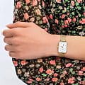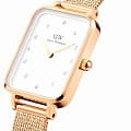 Женские наручные часы с минеральным стекломМинеральное стеклоМинеральное стекло представляет собой искусственно выращенный минерал кварца. Такое стекло отличается особой устойчивостью к повреждениям и царапинам. Уступает по некоторым качествам сапфировому стеклу. Daniel Wellington Quadro DW00100599, кварцевый механизм с высокой точностью. Корпус часов изготовлен из стали с PVD-покрытиемPVDУльтратонкое покрытие наносится в технике вакуумного напыления, сочетает в себе нитрид титана особой прочности со слоем золота или оксида хрома. Несёт в себе декоративную или защитную функцию.. Циферблат украшен фирменным логотипом Daniel Wellington и 12 кристаллами Swarovski. Накладные метки в виде штрихов. Рифленая заводная головка. Класс водозащиты: 30 метров, позволит защитить корпус от случайных брызг или капель дождя. Стальной браслет миланского плетения с PVD-покрытиемPVDУльтратонкое покрытие наносится в технике вакуумного напыления, сочетает в себе нитрид титана особой прочности со слоем золота или оксида хрома. Несёт в себе декоративную или защитную функцию. на раскладном замкеРаскладной замокДанный вариант застежки используется только на часах с металлическим браслетом. Отличительная особенность такого крепления в том, что длина браслета становится универсальной и вы можете самостоятельно отрегулировать нужный вам размер – застежка просто двигается по браслету часов..