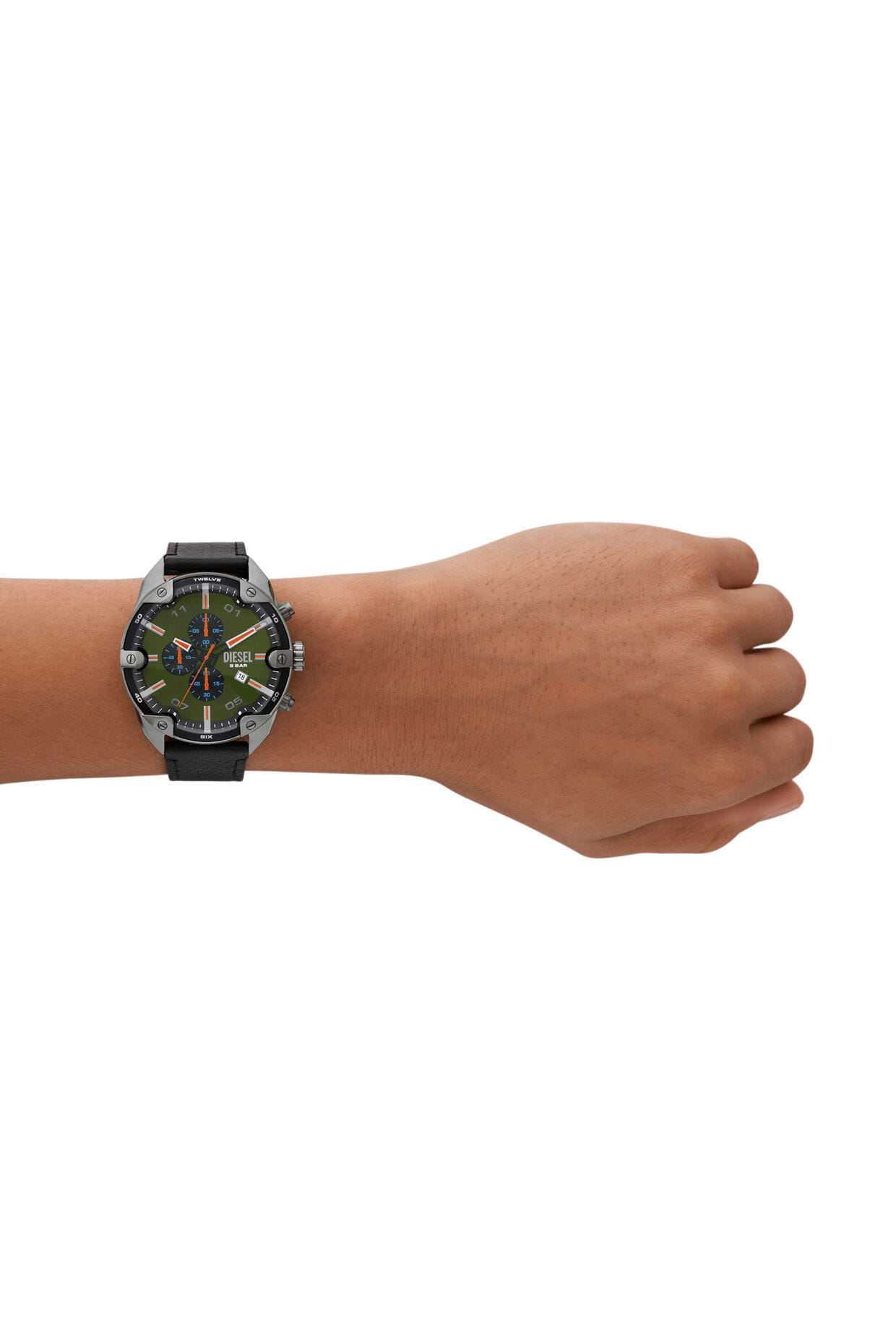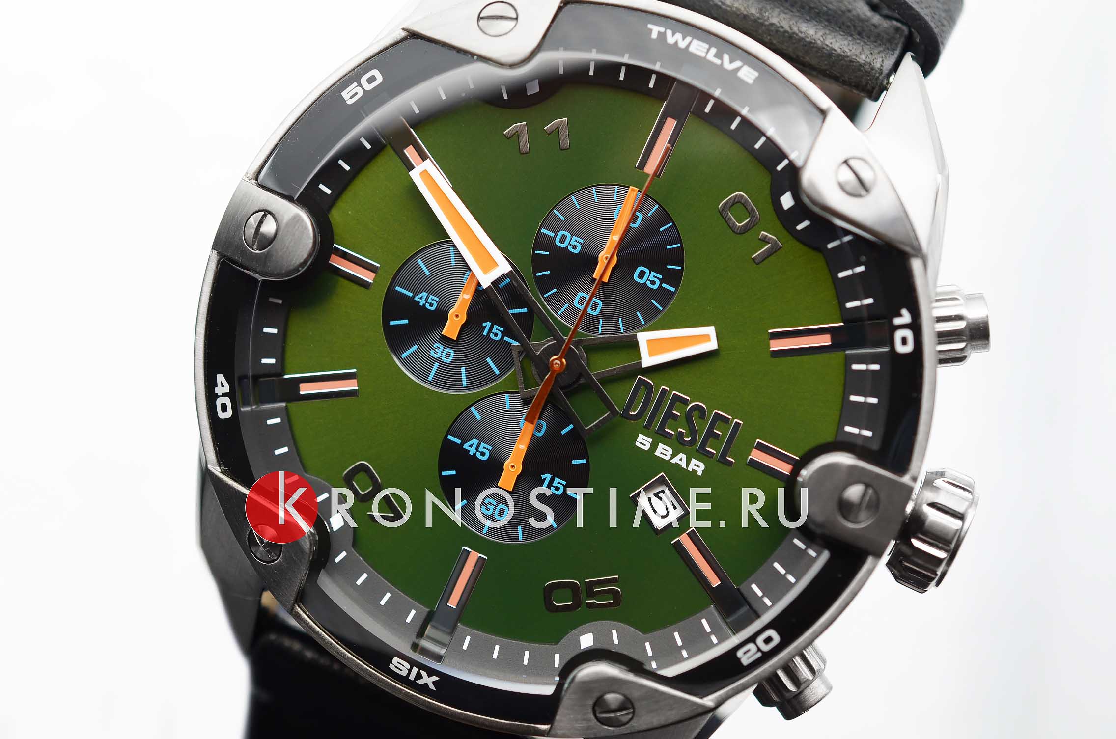 Мужские наручные часы-хронографХронографФункция позволяет измерять отрезки времени с особой точностью: часы, минуты, секунды. Верным признаком хронографа является наличие на циферблате 3 дополнительных окошек-счётчиков. с секундомеромСекундомерСекундоме́р — прибор, способный измерять интервалы времени с точностью до долей секунды. Diesel Spiked DZ4626, кварцевый механизм с высокой точностью. Минеральное стеклоМинеральное стеклоМинеральное стекло представляет собой искусственно выращенный минерал кварца. Такое стекло отличается особой устойчивостью к повреждениям и царапинам. Уступает по некоторым качествам сапфировому стеклу. устойчивое к мелким механическим повреждениям. Класс водозащиты: 50 метров, позволит защитить корпус от случайных брызг или капель дождя. Корпус часов изготовлен из стали с IP-покрытиемIP-покрытиеМетод ионного напыления. Демонстрирует повышенную устойчивость к истиранию, окислению и химическим веществам. Под воздействием высокого давления и температуры около 1500°C молекулы металла надёжно соединяются с частицами корпуса часов.. Циферблат содержит накладные метки. Кожаный ремешок на стандартной застёжке. Окошко даты находится в положении 4 часа. Стрелки и метки с люминесцентным покрытиемЛюминесцентное покрытиеПозволяет считывать показания времени в темноте. Производители наносят на стрелки, часовые индексы, безель или поверхность циферблата светонакопительный состав, дающий холодное свечение..