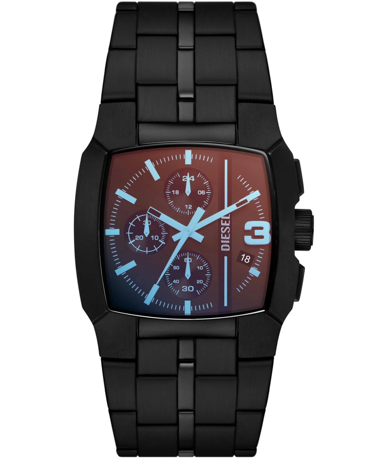 Мужские наручные часы-хронографХронографФункция позволяет измерять отрезки времени с особой точностью: часы, минуты, секунды. Верным признаком хронографа является наличие на циферблате 3 дополнительных окошек-счётчиков. с секундомеромСекундомерСекундоме́р — прибор, способный измерять интервалы времени с точностью до долей секунды. Diesel Cliffhanger DZ4640, кварцевый механизм с высокой точностью. Минеральное стеклоМинеральное стеклоМинеральное стекло представляет собой искусственно выращенный минерал кварца. Такое стекло отличается особой устойчивостью к повреждениям и царапинам. Уступает по некоторым качествам сапфировому стеклу. устойчивое к мелким механическим повреждениям. Класс водозащиты: 50 метров, позволит защитить корпус от случайных брызг или капель дождя. Квадратный корпус часов изготовлен из стали с IP-покрытиемIP-покрытиеМетод ионного напыления. Демонстрирует повышенную устойчивость к истиранию, окислению и химическим веществам. Под воздействием высокого давления и температуры около 1500°C молекулы металла надёжно соединяются с частицами корпуса часов.. Стальной браслет на раскладной застёжкеРаскладная застёжкаТакой тип застёжки используется только на браслетах из металла. Она никогда не раскрывается полностью, происходит разделение на 2 и более частей. Раскладывающая застёжка снизит вероятность потери часов к минимуму.. Окошко даты в области 4 часов.