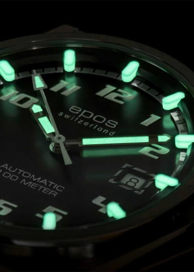 Мужские механические часы с автоподзаводом Epos из коллекции Sportive — это стильный и надёжный аксессуар с швейцарским качеством. Корпус диаметром 41 мм и толщиной 11 мм выполнен из нержавеющей стали 316L. Циферблат чёрного цвета оформлен по технологии «солнечные лучи» (Sunray) и дополнен метками в виде штрихов и арабских цифр. Циферблат защищён сапфировым стекломСапфировое стеклоПрочный и надёжный материал из кристалла сапфира синтетического происхождения, характеризующийся особой твёрдостью и устойчивостью к царапинам и повреждениям.. Стрелки и объёмные метки с люминесцентным покрытиемЛюминесцентное покрытиеПозволяет считывать показания времени в темноте. Производители наносят на стрелки, часовые индексы, безель или поверхность циферблата светонакопительный состав, дающий холодное свечение., обеспечивающим отличную читаемость в темноте. Механизм — швейцарский калибр Sellita SW200 с запасом хода 38 часов. Окошко даты расположено в положении 3 часов. Завинчивающаяся коронка обеспечивает дополнительную защиту. Прозрачная задняя крышка позволяет наблюдать за работой механизма. Часы оснащены стальным браслетом на раскладной застёжкеРаскладная застёжкаТакой тип застёжки используется только на браслетах из металла. Она никогда не раскрывается полностью, происходит разделение на 2 и более частей. Раскладывающая застёжка снизит вероятность потери часов к минимуму.. Водонепроницаемость 100 м позволяет использовать часы для плавания и повседневного ношения. Гарантия — 24 месяца. Универсальный выбор для ценителя механики и спортивного стиля.