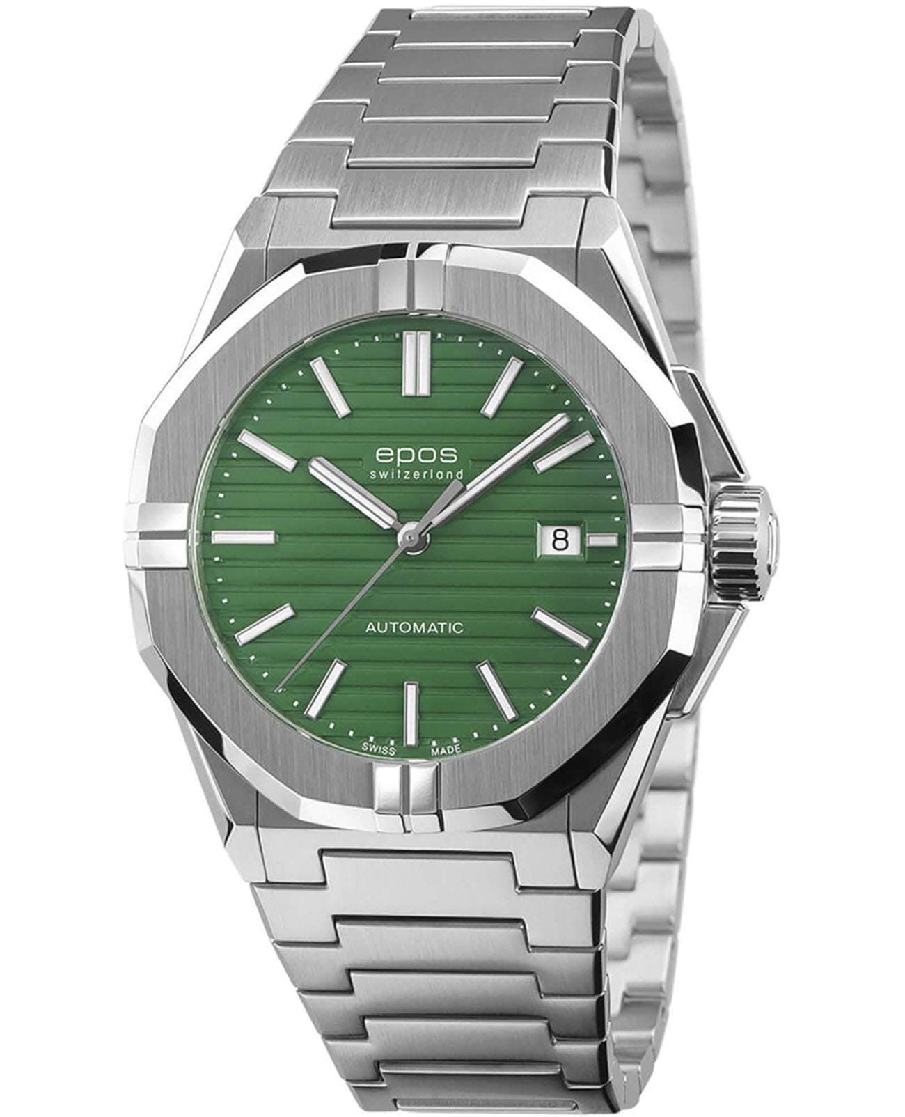 Мужские механические часы с автоподзаводом Epos из коллекции Sportive — это стильный и надёжный аксессуар с швейцарским качеством. Корпус диаметром 41 мм и толщиной 10,7 мм выполнен из нержавеющей стали 316L. Циферблат зелёного цвета оформлен рифлёным узором и метками в виде штрихов. Циферблат защищён сапфировым стекломСапфировое стеклоПрочный и надёжный материал из кристалла сапфира синтетического происхождения, характеризующийся особой твёрдостью и устойчивостью к царапинам и повреждениям.. Стрелки и метки с люминесцентным покрытиемЛюминесцентное покрытиеПозволяет считывать показания времени в темноте. Производители наносят на стрелки, часовые индексы, безель или поверхность циферблата светонакопительный состав, дающий холодное свечение., обеспечивающим хорошую читаемость в темноте. Механизм — швейцарский калибр ETA 2824. Окошко даты расположено в положении 3 часов. Завинчивающаяся коронка обеспечивает дополнительную защиту. Прозрачная задняя крышка позволяет наблюдать за работой декорированного механизма. Часы оснащены стальным браслетом на застёжке «бабочка» с кнопкамиЗастёжка "бабочка"Такой вид застёжки дополняется предохранителями, помогающими избежать случайного раскрытия браслета. Обладают изящным исполнением. . Водонепроницаемость 100 м позволяет использовать часы для плавания и повседневного ношения. Гарантия — 24 месяца. Универсальный выбор для ценителя механики и элегантного спортивного стиля.