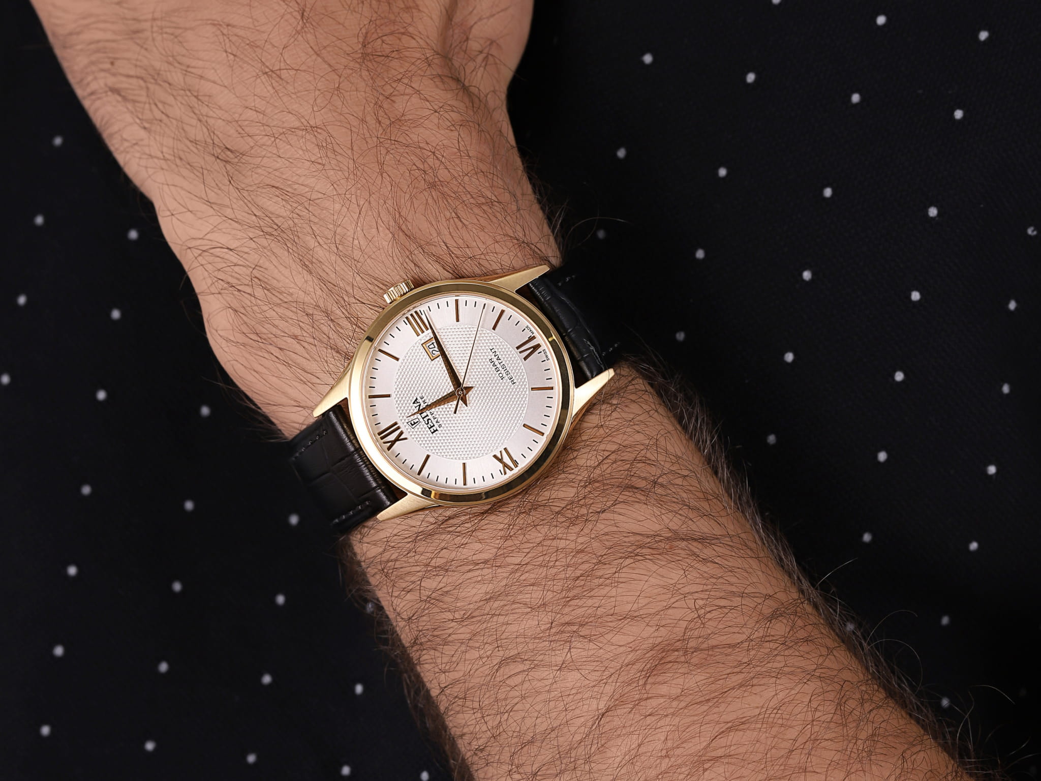 Сапфировое стеклоСапфировое стеклоПрочный и надёжный материал из кристалла сапфира синтетического происхождения, характеризующийся особой твёрдостью и устойчивостью к царапинам и повреждениям. устойчивое к появлению царапин, обладающее высокой прозрачностью. Циферблат декорирован узором. Класс водозащиты: 100 метров, позволит плавать, нырять и заниматься другими водными видами спорта. Корпус часов изготовлен из нержавеющей стали с PVDPVDУльтратонкое покрытие наносится в технике вакуумного напыления, сочетает в себе нитрид титана особой прочности со слоем золота или оксида хрома. Несёт в себе декоративную или защитную функцию. покрытием. Натуральной кожаный ремешок с классической застежкой, ширина браслета 20мм. Рифленая заводная головка.