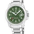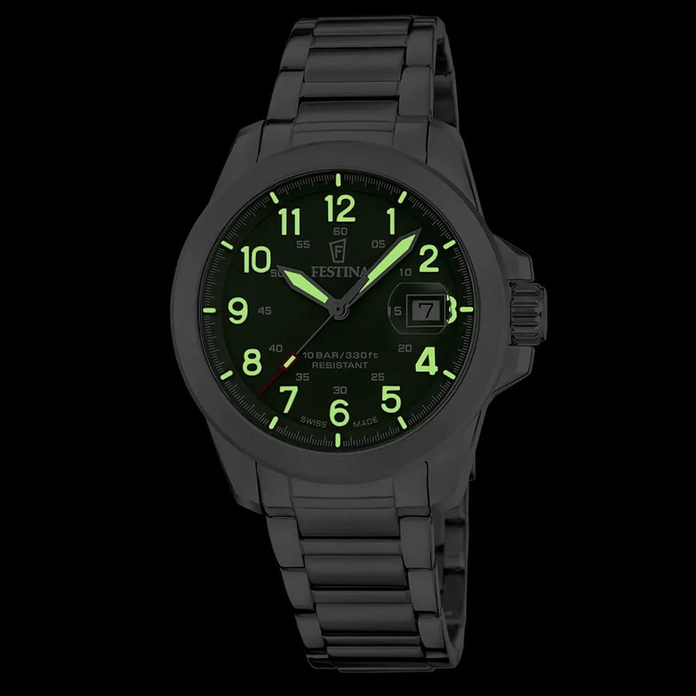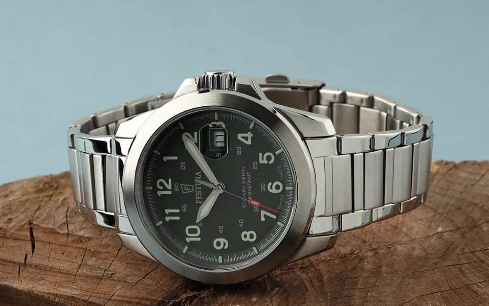 Мужские кварцевые часы Festina F20081/3 из коллекции Swiss Made — это стильный аксессуар с швейцарским качеством и лаконичным дизайном. Корпус диаметром 42 мм и толщиной 11 мм выполнен из нержавеющей стали серебряного цвета. Циферблат зелёного цвета оформлен индексами и дополнен окошком даты в положении 3 часов. Циферблат защищён сапфировым стекломСапфировое стеклоПрочный и надёжный материал из кристалла сапфира синтетического происхождения, характеризующийся особой твёрдостью и устойчивостью к царапинам и повреждениям. с антибликовым покрытиемАнтибликовое покрытиеСлой оксида металла в 0,13-0,3 микрон, благодаря которому стекло часов не бликует и не отражает свет. Антибликовое покрытие уменьшает отражение света в 10 раз, обеспечивая отличную читаемость показателей циферблата.. Стрелки и метки с люминесцентным покрытиемЛюминесцентное покрытиеПозволяет считывать показания времени в темноте. Производители наносят на стрелки, часовые индексы, безель или поверхность циферблата светонакопительный состав, дающий холодное свечение., обеспечивающим хорошую читаемость в темноте. Завинчивающаяся коронка и задняя крышка повышают надёжность конструкции. Часы оснащены стальным браслетом на раскладной застёжкеРаскладная застёжкаТакой тип застёжки используется только на браслетах из металла. Она никогда не раскрывается полностью, происходит разделение на 2 и более частей. Раскладывающая застёжка снизит вероятность потери часов к минимуму. с кнопками. Механизм — кварцевый калибр Ronda 715 с 60-месячным сроком службы батареи. Водонепроницаемость 100 м позволяет использовать часы для плавания. Универсальный выбор для тех, кто ценит точность, надёжность и классический стиль.