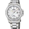 Кварцевый механизм с высокой точностью. Минеральное стеклоМинеральное стеклоМинеральное стекло представляет собой искусственно выращенный минерал кварца. Такое стекло отличается особой устойчивостью к повреждениям и царапинам. Уступает по некоторым качествам сапфировому стеклу. устойчивое к появлению царапин, обладающее высокой прозрачностью. Стрелки с люминесцентным покрытиемЛюминесцентное покрытиеПозволяет считывать показания времени в темноте. Производители наносят на стрелки, часовые индексы, безель или поверхность циферблата светонакопительный состав, дающий холодное свечение.. Циферблат инкрустирован кристаллами. Окошко даты с увеличительным стеклом. Класс водозащиты: 100 метров, позволит плавать, нырять и заниматься другими водными видами спорта. Поворотный безельБезельВнешний ободок, закрепляющий стекло. В спортивных часах так называется поворотное кольцо с делениями на циферблате, выполняет роль таймера – замеряет отрезки времени на шкале. Неподвижный безель – элемент декора. Однонаправленно вращающийся безель на дайверских часах позволяет фиксировать моменты погружения и выныривания на поверхность.. Корпус часов изготовлен из нержавеющей стали. Браслет с раскладной застёжкойРаскладная застёжкаТакой тип застёжки используется только на браслетах из металла. Она никогда не раскрывается полностью, происходит разделение на 2 и более частей. Раскладывающая застёжка снизит вероятность потери часов к минимуму.. Застежка с системой блокировки.