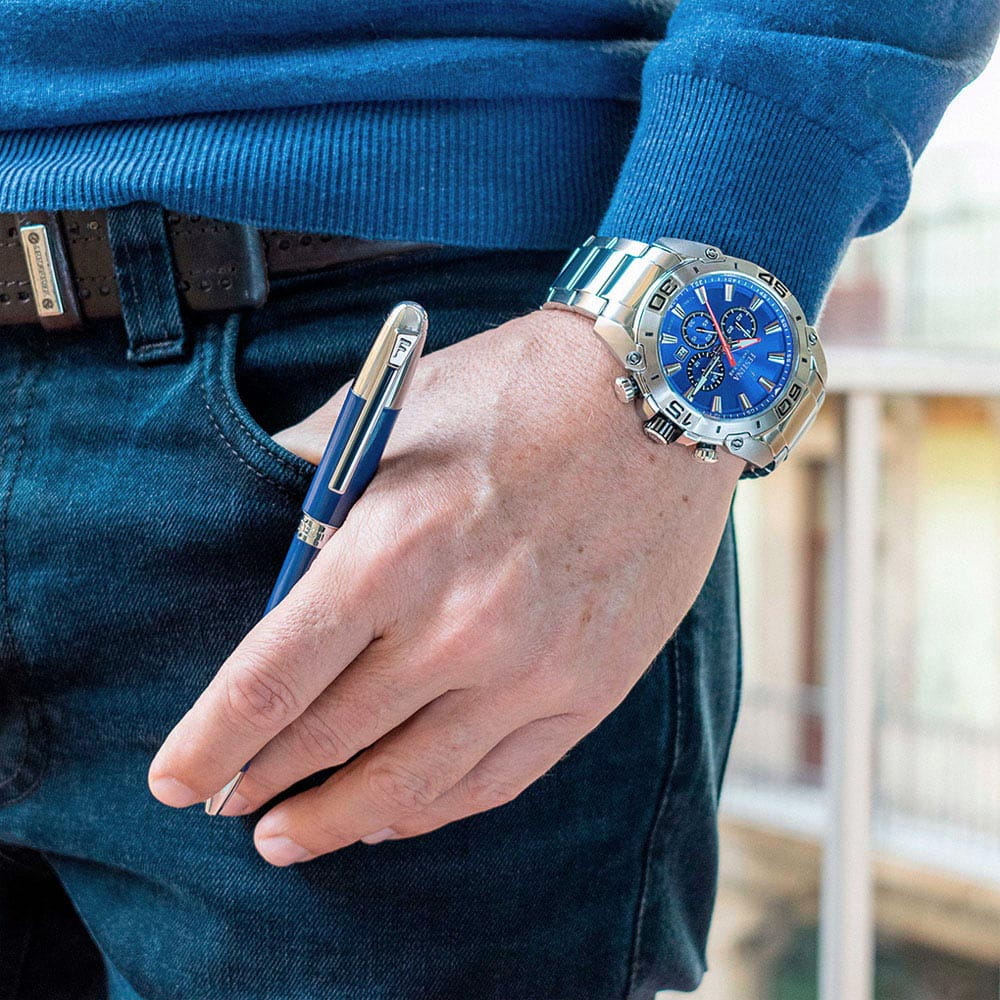 Часы-хронографХронографФункция позволяет измерять отрезки времени с особой точностью: часы, минуты, секунды. Верным признаком хронографа является наличие на циферблате 3 дополнительных окошек-счётчиков.. Кварцевый механизм с высокой точностью. Минеральное стеклоМинеральное стеклоМинеральное стекло представляет собой искусственно выращенный минерал кварца. Такое стекло отличается особой устойчивостью к повреждениям и царапинам. Уступает по некоторым качествам сапфировому стеклу. устойчивое к появлению царапин, обладающее высокой прозрачностью. Класс водозащиты: 100 метров, позволит плавать, нырять и заниматься другими водными видами спорта. Стрелки и метки с люминесцентным покрытиемЛюминесцентное покрытиеПозволяет считывать показания времени в темноте. Производители наносят на стрелки, часовые индексы, безель или поверхность циферблата светонакопительный состав, дающий холодное свечение.. Корпус часов изготовлен из нержавеющей стали. Браслет с раскладной застёжкойРаскладная застёжкаТакой тип застёжки используется только на браслетах из металла. Она никогда не раскрывается полностью, происходит разделение на 2 и более частей. Раскладывающая застёжка снизит вероятность потери часов к минимуму..
