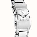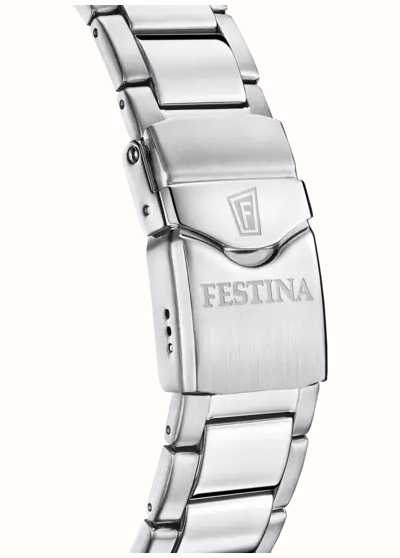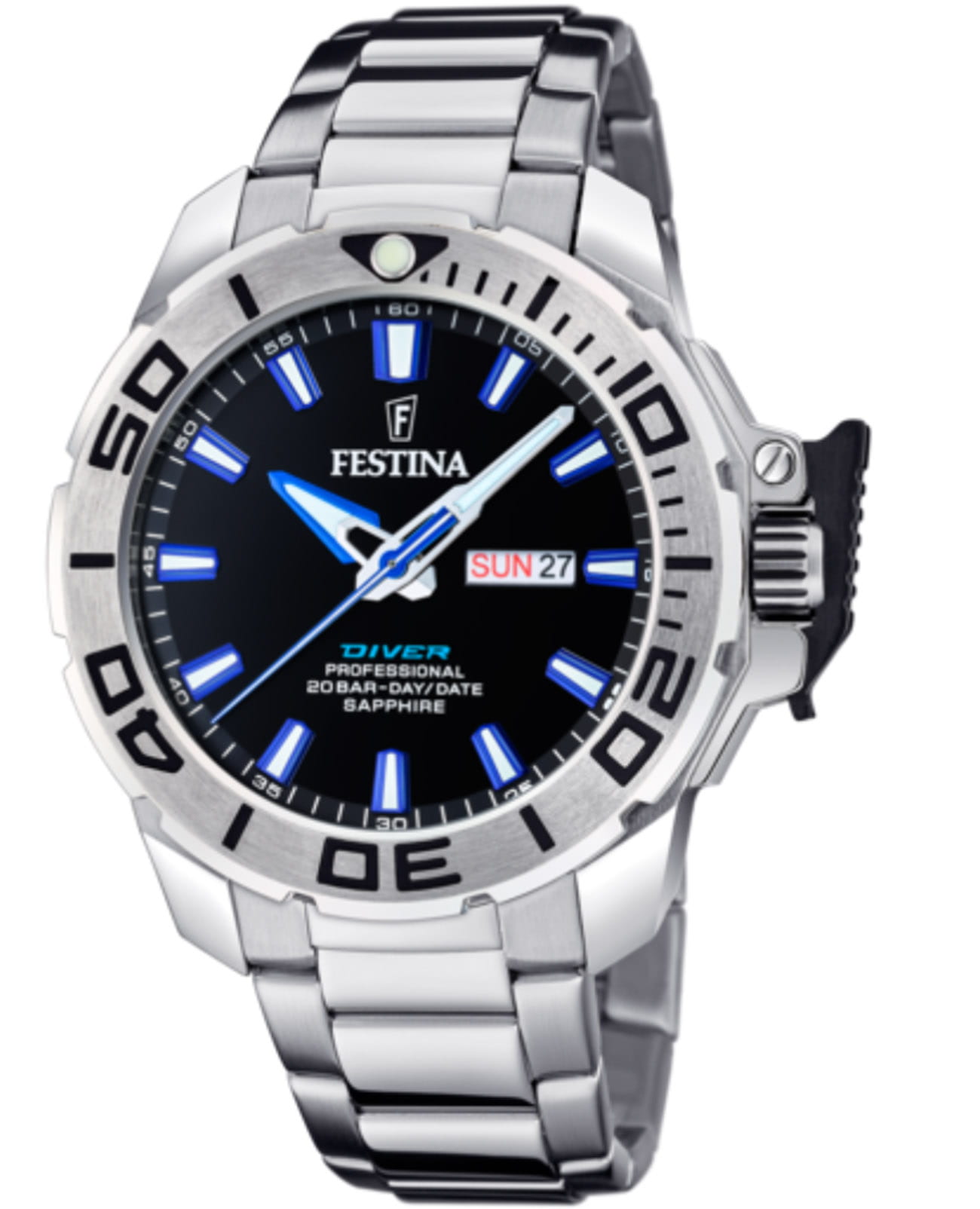 Мужские часы Festina The originals F20665/3, кварцевый механизм с высокой точностью. Сапфировое стеклоСапфировое стеклоПрочный и надёжный материал из кристалла сапфира синтетического происхождения, характеризующийся особой твёрдостью и устойчивостью к царапинам и повреждениям. устойчивое к появлению царапин, обладающее высокой прозрачностью. Класс водозащиты: 200 метров, позволит плавать, нырять и заниматься другими водными видами спорта. Корпус часов изготовлен из нержавеющей стали 316L. Стальной браслет на раскладной застёжкеРаскладная застёжкаТакой тип застёжки используется только на браслетах из металла. Она никогда не раскрывается полностью, происходит разделение на 2 и более частей. Раскладывающая застёжка снизит вероятность потери часов к минимуму.. Окошко даты находится в положении 3 часа. Вращающийся стальной безельБезельВнешний ободок, закрепляющий стекло. В спортивных часах так называется поворотное кольцо с делениями на циферблате, выполняет роль таймера – замеряет отрезки времени на шкале. Неподвижный безель – элемент декора. Однонаправленно вращающийся безель на дайверских часах позволяет фиксировать моменты погружения и выныривания на поверхность.. Стрелки и метки с люминесцентным покрытиемЛюминесцентное покрытиеПозволяет считывать показания времени в темноте. Производители наносят на стрелки, часовые индексы, безель или поверхность циферблата светонакопительный состав, дающий холодное свечение..