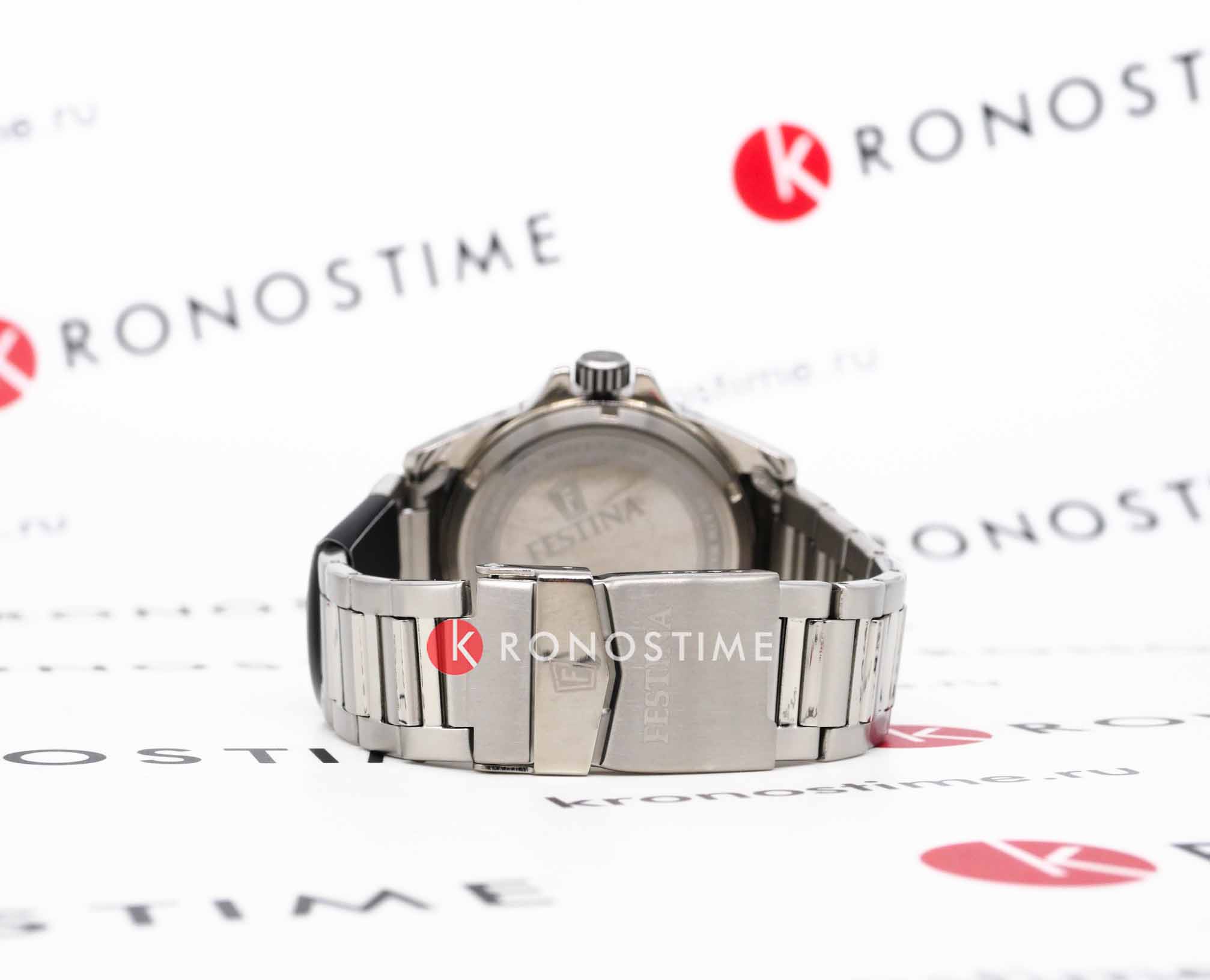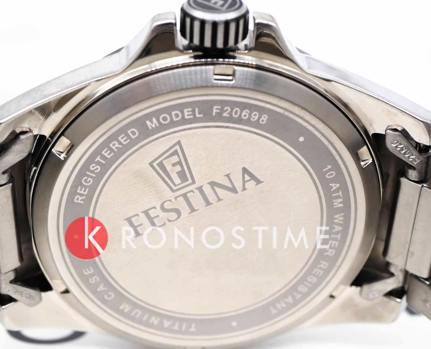 Титановые наручные часы Festina Titanium F20698/2 имеют кварцевый механизм с высокой точностью. Минеральное стеклоМинеральное стеклоМинеральное стекло представляет собой искусственно выращенный минерал кварца. Такое стекло отличается особой устойчивостью к повреждениям и царапинам. Уступает по некоторым качествам сапфировому стеклу. устойчивое к появлению царапин, обладающее высокой прозрачностью, защищает синий циферблат. БезельБезельВнешний ободок, закрепляющий стекло. В спортивных часах так называется поворотное кольцо с делениями на циферблате, выполняет роль таймера – замеряет отрезки времени на шкале. Неподвижный безель – элемент декора. Однонаправленно вращающийся безель на дайверских часах позволяет фиксировать моменты погружения и выныривания на поверхность. с часовыми метками выполнен из нержавеющей стали с синим PVDPVDУльтратонкое покрытие наносится в технике вакуумного напыления, сочетает в себе нитрид титана особой прочности со слоем золота или оксида хрома. Несёт в себе декоративную или защитную функцию. покрытием. Класс водозащиты: 100 метров, позволит плавать, нырять и заниматься другими водными видами спорта. Корпус часов изготовлен из титана, браслет также изготовлен из титана и имеет раскладную застёжкуРаскладная застёжкаТакой тип застёжки используется только на браслетах из металла. Она никогда не раскрывается полностью, происходит разделение на 2 и более частей. Раскладывающая застёжка снизит вероятность потери часов к минимуму.. Люминесцентное покрытиеЛюминесцентное покрытиеПозволяет считывать показания времени в темноте. Производители наносят на стрелки, часовые индексы, безель или поверхность циферблата светонакопительный состав, дающий холодное свечение. на стрелках и метках обеспечивает отличную видимость в темноте, а окошко даты с днем недели, расположенное в позиции 3 часа, добавляет практичности.