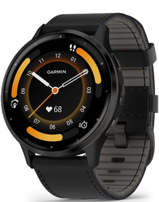 Умные многофункциональные мужские часы Garmin Venu 3 010-02784-52, электронный механизм с высокой точностью. Класс водозащиты: 50 метров, позволит защитить корпус от случайных брызг или капель дождя. Материал корпуса: пластик. Циферблат с минеральным стекломМинеральное стеклоМинеральное стекло представляет собой искусственно выращенный минерал кварца. Такое стекло отличается особой устойчивостью к повреждениям и царапинам. Уступает по некоторым качествам сапфировому стеклу.. Экран с светодиодной подсветкойСветодиодная подсветкаСветодиодная или LED-подсветка обеспечивает появление яркого холодного свечения за счёт LED-элементов - маленьких лампочек. Они потребляют минимальное количество энергии, чаще всего можно встретить 1 светодиод, в нижней части циферблата..БезельБезельВнешний ободок, закрепляющий стекло. В спортивных часах так называется поворотное кольцо с делениями на циферблате, выполняет роль таймера – замеряет отрезки времени на шкале. Неподвижный безель – элемент декора. Однонаправленно вращающийся безель на дайверских часах позволяет фиксировать моменты погружения и выныривания на поверхность. из нержавеющей стали. Кожаный ремешок на стандартной застёжке.
