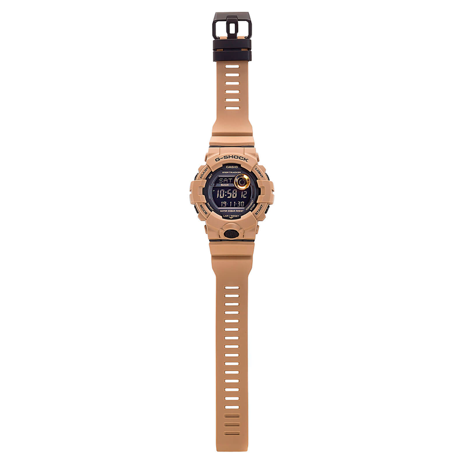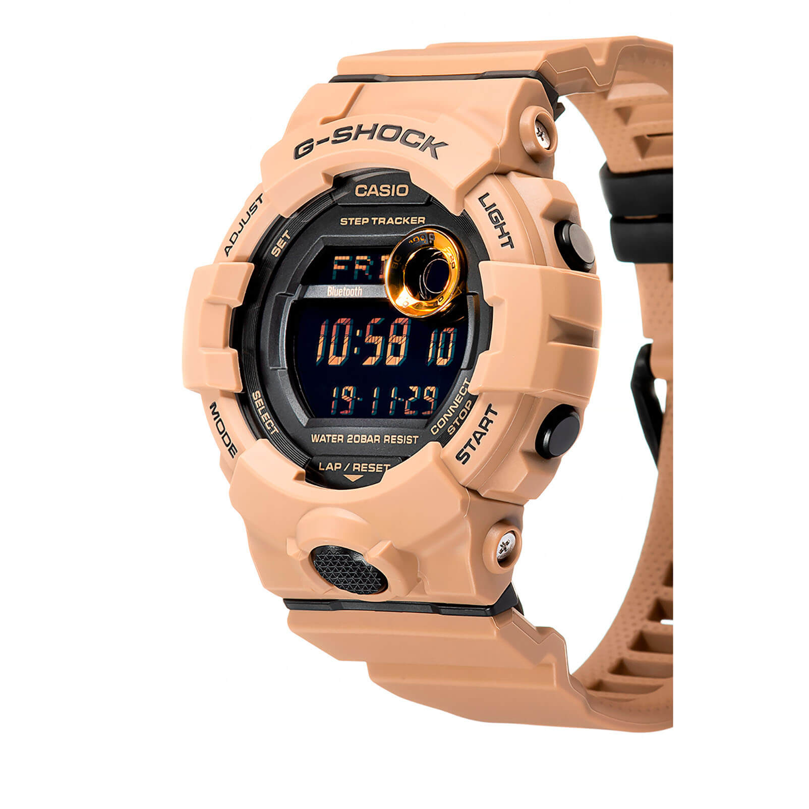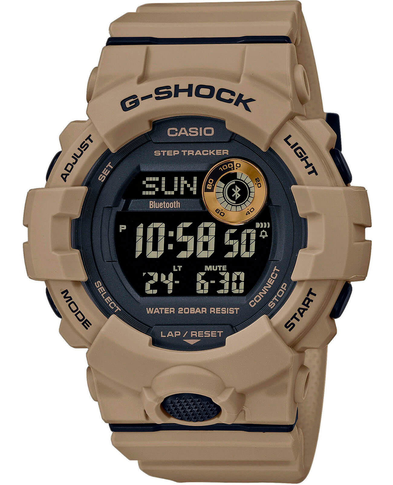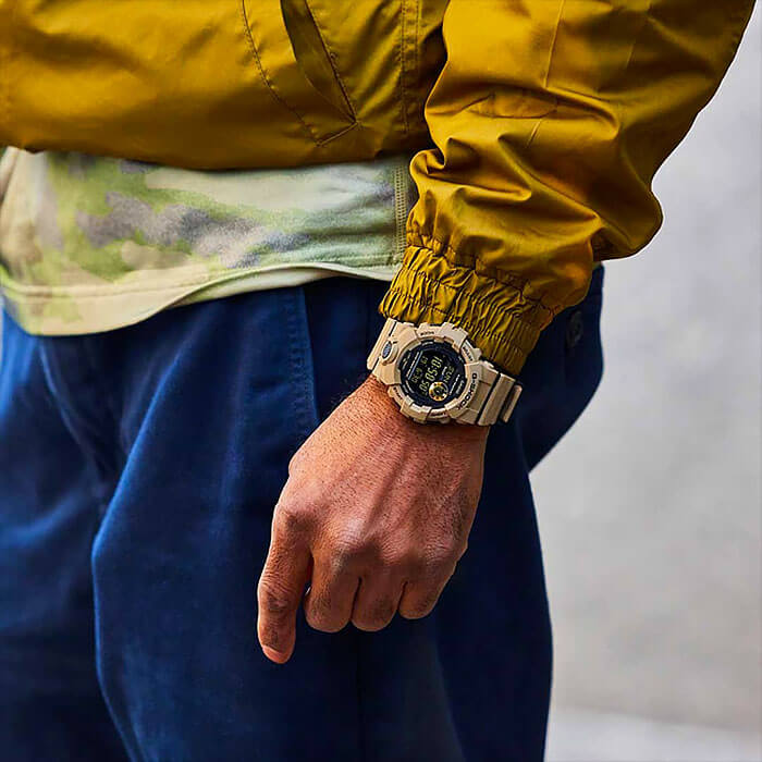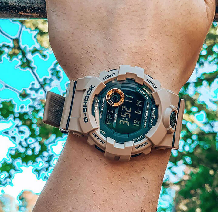 Это не просто стильный и практичный аксессуар, модель песочного цвета является идеальным помощником в правильной организации тренировок. Часы для фитнеса и бега оснащены шагомером, измеряющим их в количестве от 0 до 999999, многофункциональным таймером, секундомером с памятью на 200 результатов. С помощью технологии BluetoothBluetoothСовременная технология, позволяющая синхронизировать часы с телефоном и переносить данные. Часы с Bluetooth расширяют возможности вашего смартфона и делают его использование ещё более удобным. данные о физической активности могут передаваться и анализироваться в вашем смартфоне, для этого было разработано приложение G-Shock Connected Phone. Кварцевый механизм японского производства. Батарейка рассчитана на 3 года работы. Ударопрочный корпусУдаропрочный корпусМеханизм заключён в корпус, выполненный из современных материалов, устойчивых к ударам, механическим повреждениям и падению с высоты: инновационный пластик, карбон, нержавеющая сталь, титан. из полимерного материала. Минеральное стекло. Водостойкость до 20 бар. Циферблат со светодиодной подсветкойСветодиодная подсветкаСветодиодная или LED-подсветка обеспечивает появление яркого холодного свечения за счёт LED-элементов - маленьких лампочек. Они потребляют минимальное количество энергии, чаще всего можно встретить 1 светодиод, в нижней части циферблата., стрелки с люминесцентным покрытиемЛюминесцентное покрытиеПозволяет считывать показания времени в темноте. Производители наносят на стрелки, часовые индексы, безель или поверхность циферблата светонакопительный состав, дающий холодное свечение.. Будильник, мировое времяМировое время Полезное часовое усложнение, отображающее время в основных городах и известных областях по всему миру, оно связано с часовыми поясами, удобно для путешественников и бизнесменов. , календарь до 2099 года, функция поиска телефона, хронографХронографФункция позволяет измерять отрезки времени с особой точностью: часы, минуты, секунды. Верным признаком хронографа является наличие на циферблате 3 дополнительных окошек-счётчиков.. Габариты: 54,1 x 48,6 x 15,5 мм.